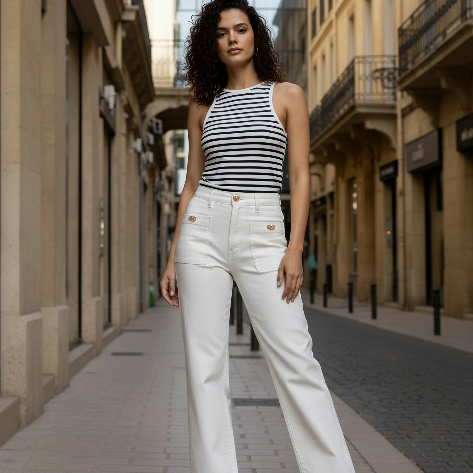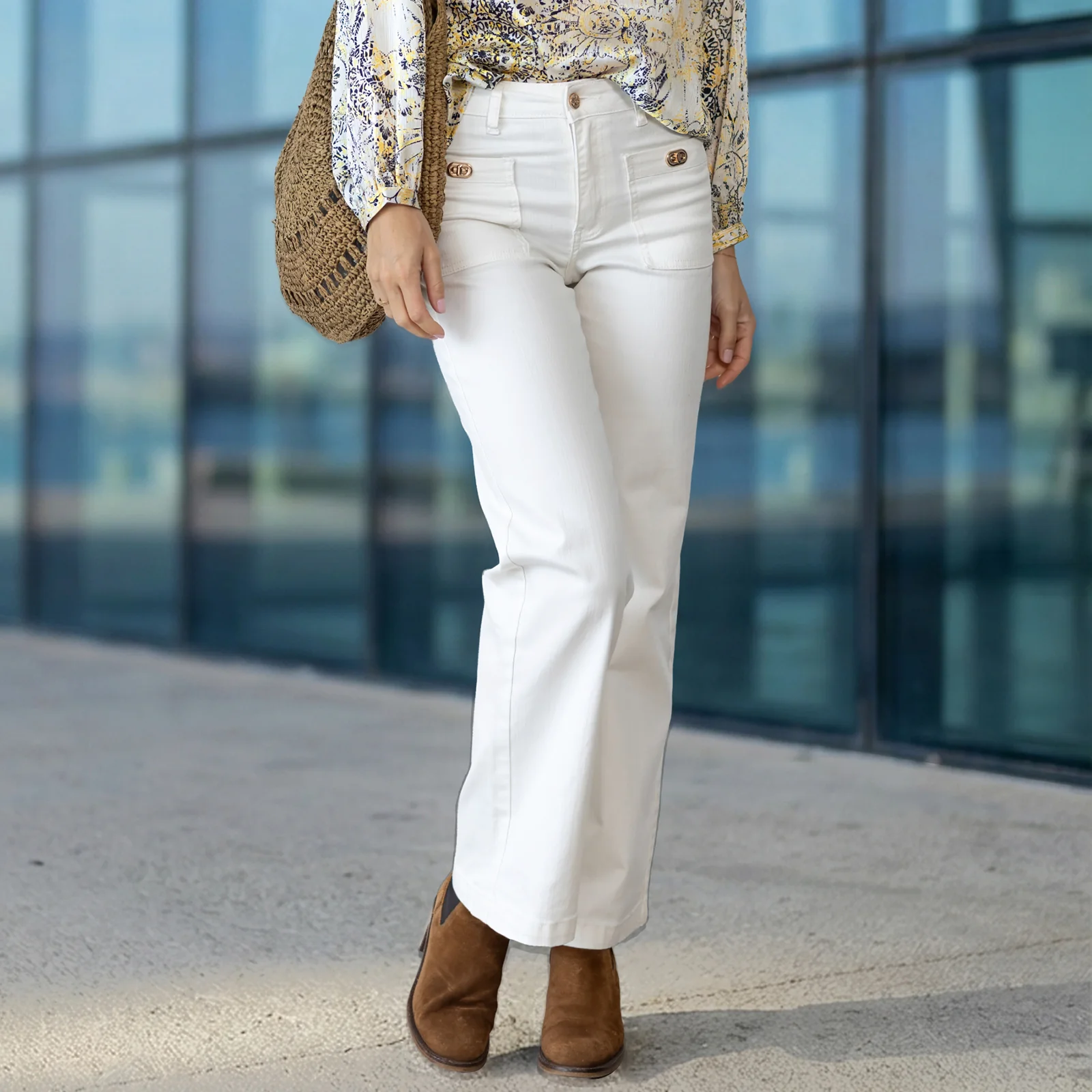 Ouverture devant par un bouton jean gravé et un zip en métal coloris champagne