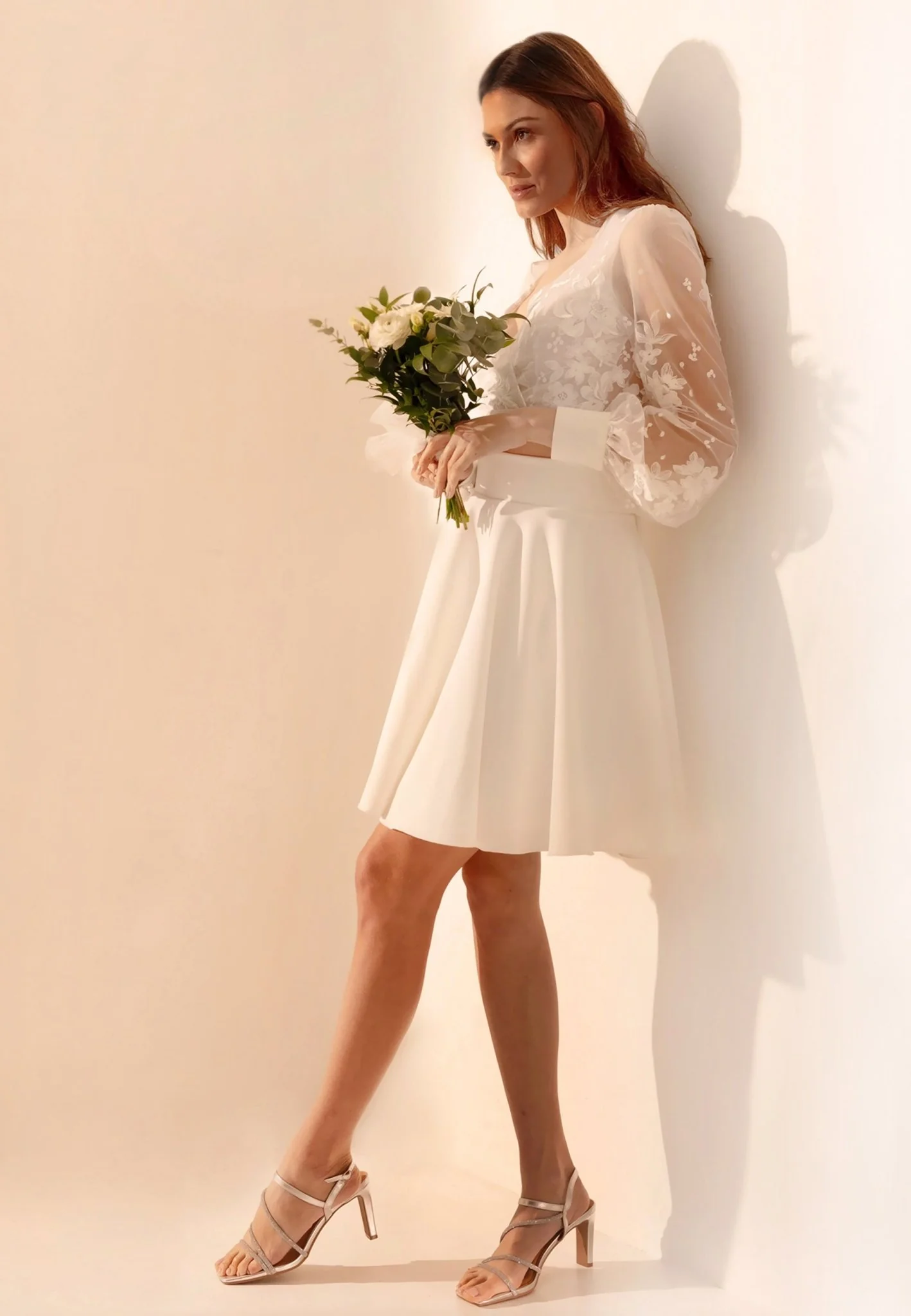 Découvrez notre jupe de mariage courte en crêpe à coupe évasée, un choix polyvalent pour votre mariage. Confectionnée avec soin, cette jupe allie élégance et confort pour vous offrir une tenue exceptionnelle le jour de votre mariage. Elle s’associe parfaitement avec tous nos hauts, vous permettant de personnaliser votre propre style de robe de mariée. De plus, sa coupe évasée apporte une touche de légèreté et de mouvement à votre tenue, ce qui en fait un choix idéal pour danser et célébrer en toute liberté. Que ce soit pour un mariage civil ou comme deuxième look pour votre journée spéciale, cette jupe est une option polyvalente qui vous permettra de briller lors de votre mariage inoubliable.