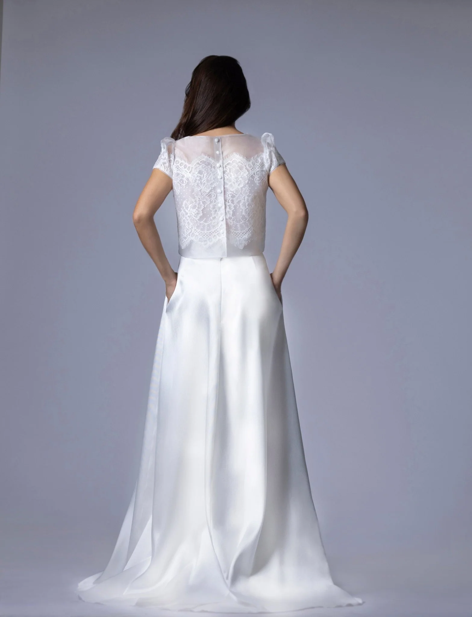Découvrez notre somptueuse jupe en satin de micado léger, une pièce élégante et polyvalente conçue pour compléter votre tenue de mariage.