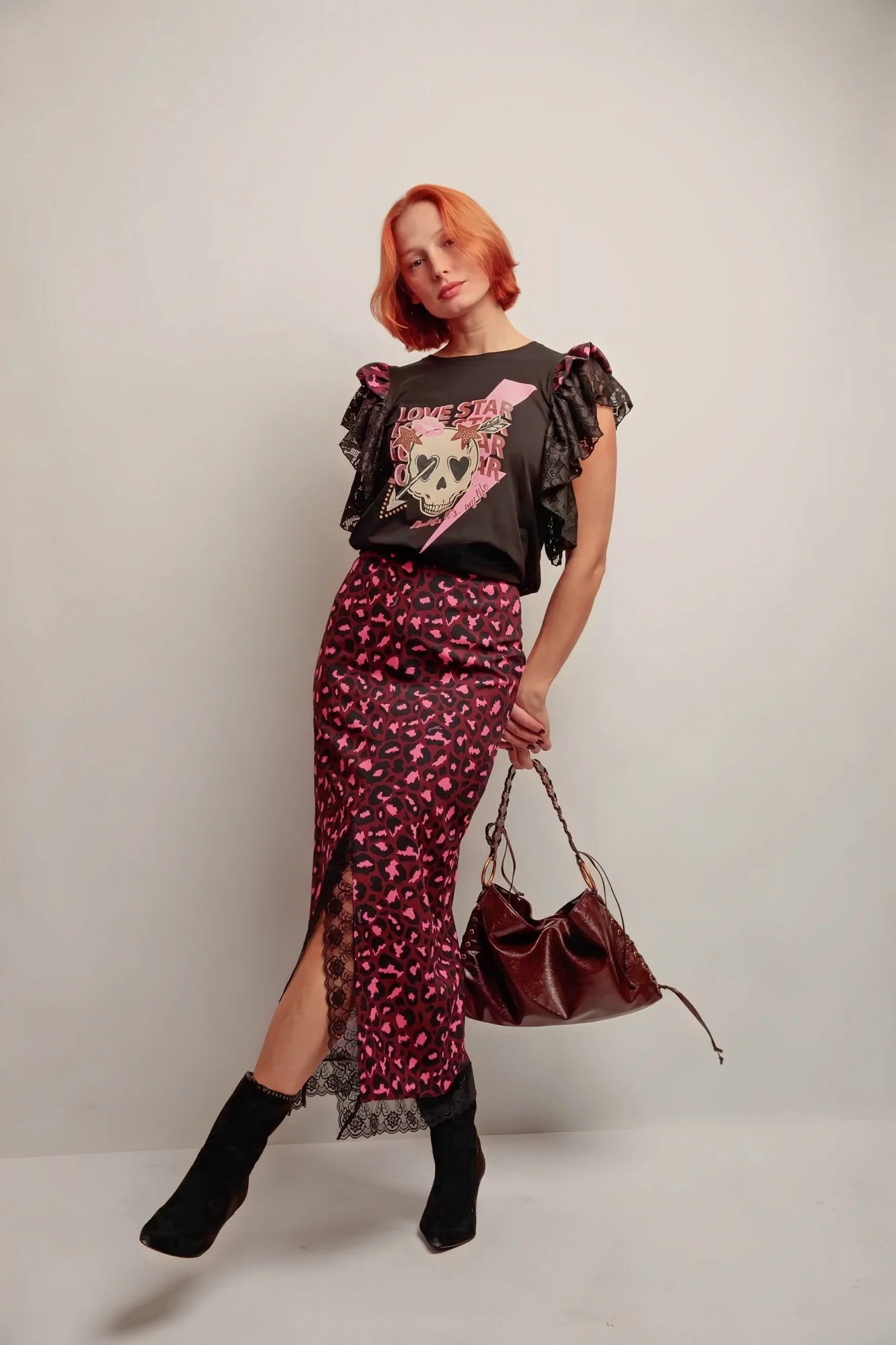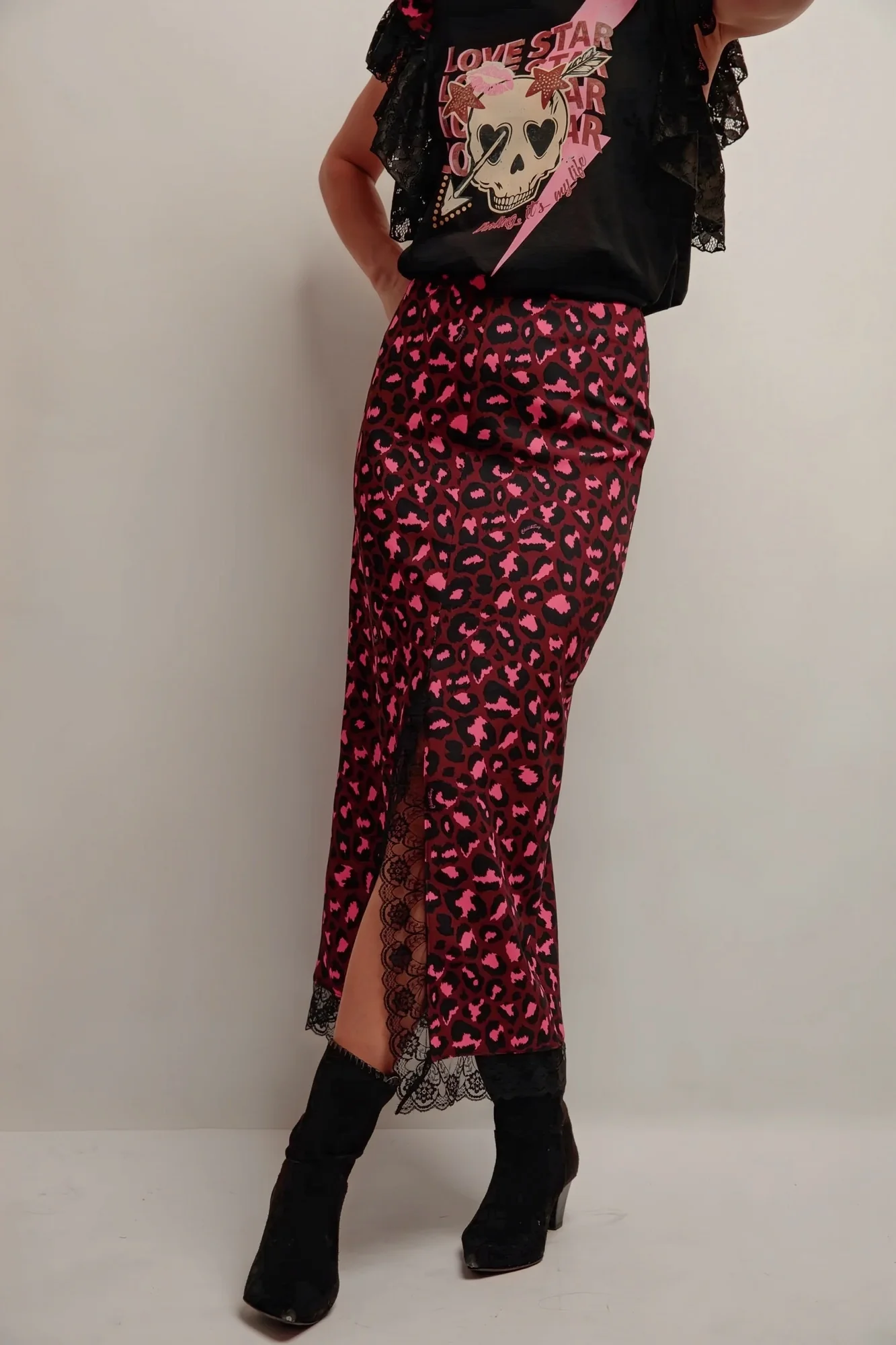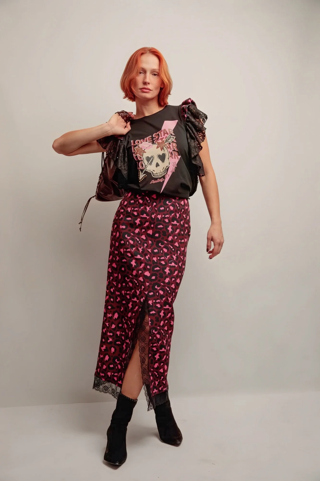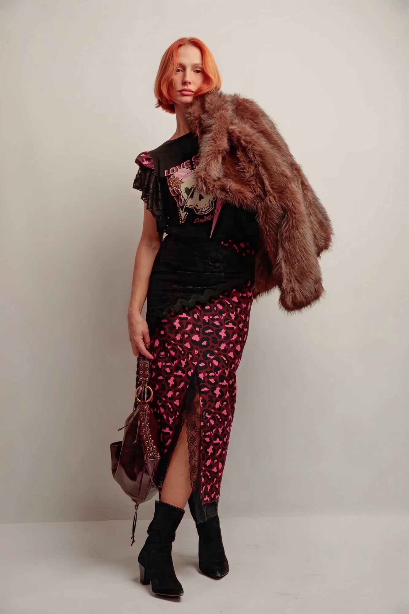 La jupe Caye séduit par sa ligne longue et élancée. Sa dentelle délicate et son imprimé animal sur fond noir et rose créent un contraste subtil, idéal pour une allure féminine et contemporaine.