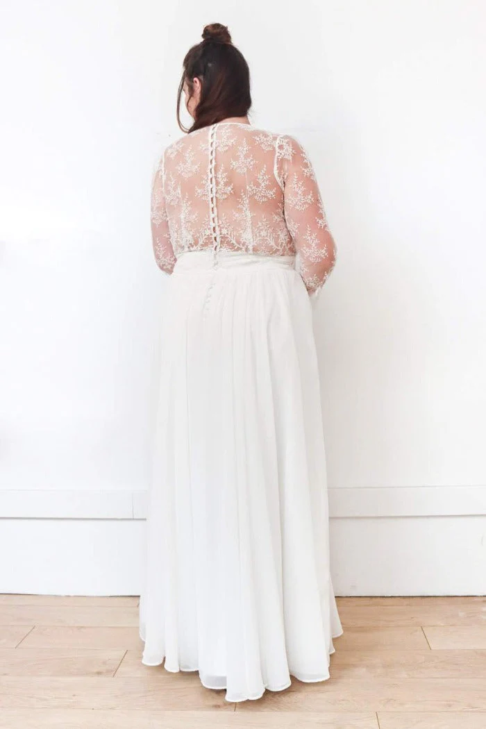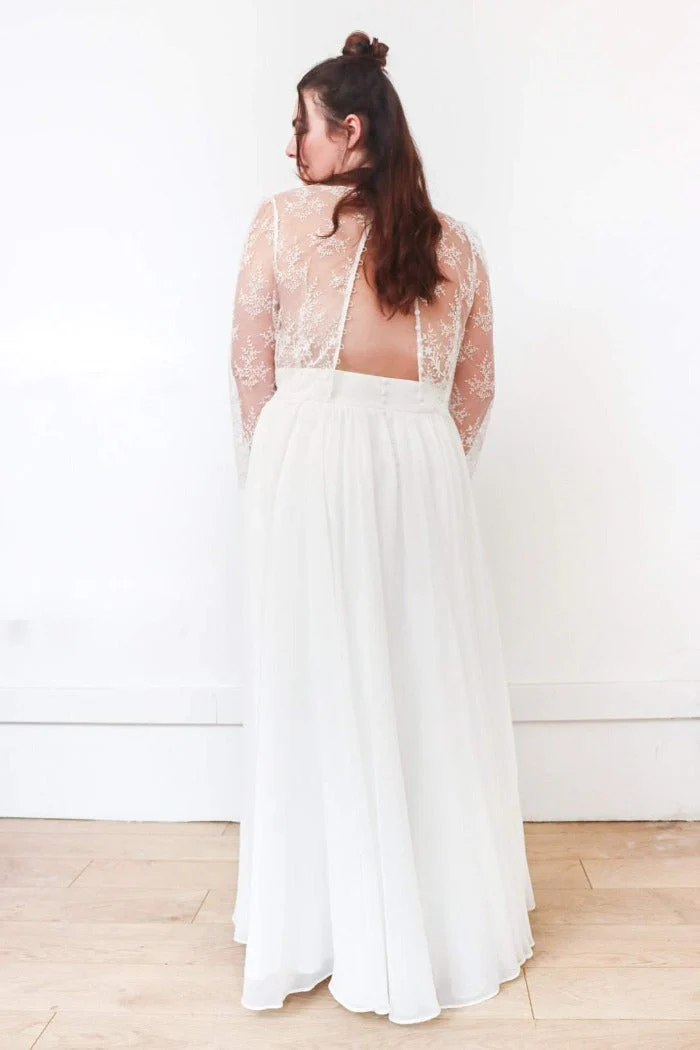 Jupe cercle, froncée à la taille, en mousseline avec ceinture large et boutons au dos. Fermeture zip invisible côté.