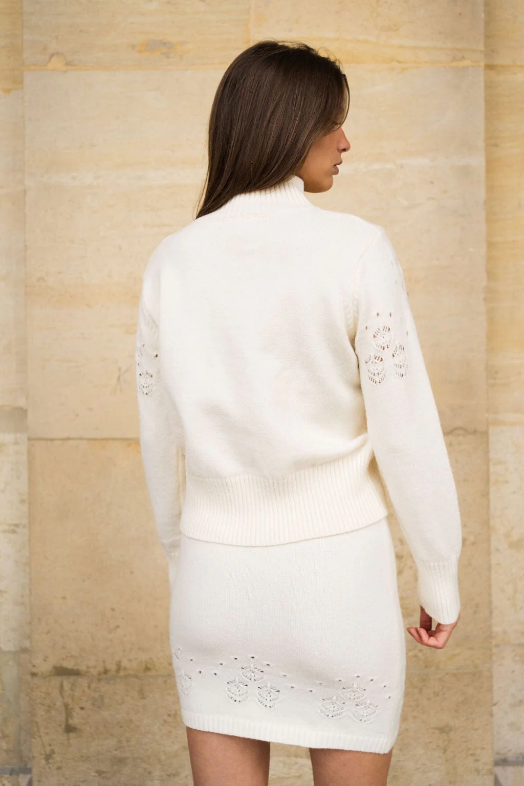 Explorez une nouvelle dimension de sophistication avec notre jupe en maille couleur écru, une pièce qui allie confort et élégance. L’ajouré subtil au bas de la jupe ajoute une touche délicate et romantique à l’ensemble, créant une silhouette aérée et captivante. La ceinture élastique assure un ajustement confortable tout en soulignant la taille de manière flatteuse. Que ce soit pour une journée au bureau ou une soirée spéciale, cette jupe en maille écru est la toile parfaite pour exprimer votre style unique. Vous vous sentirez à la fois confortable et confiante, enveloppée dans une élégance intemporelle qui ne passera pas inaperçue.