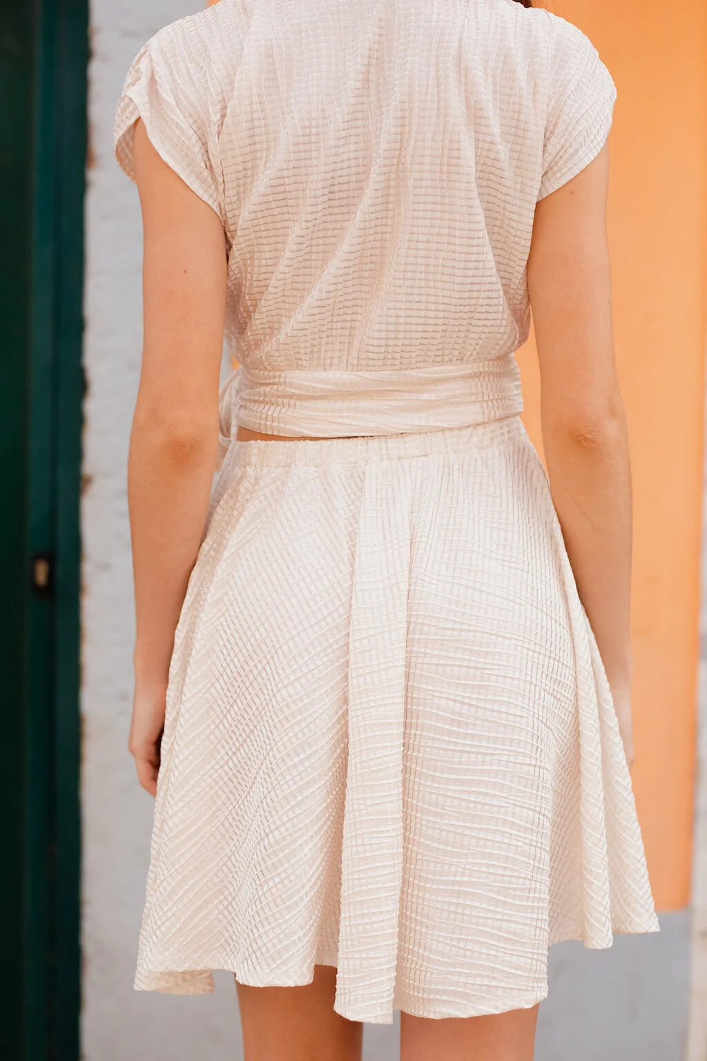La Jupe Vibrante est une célébration de la joie et de la légèreté, une pièce essentielle pour insuffler une dose de fraîcheur à votre garde-robe. Cette jupe courte, avec sa coupe en forme de cercle, offre une silhouette dynamique et flottante, parfaite pour les beaux jours et les soirées dansantes. Confectionnée dans un tissu gaufré, elle capte l’essence du confort tout en ajoutant une texture riche et intéressante au toucher. Sa couleur écru, à la fois douce et versatile, se marie aisément avec une multitude de hauts, vous permettant de jouer avec les styles. La ceinture élastique assure un ajustement parfait et confortable à la taille, faisant de la Jupe Vibrante un choix aussi pratique qu’esthétique. Adoptez cette jupe pour une allure pleine de charme et de vivacité.
