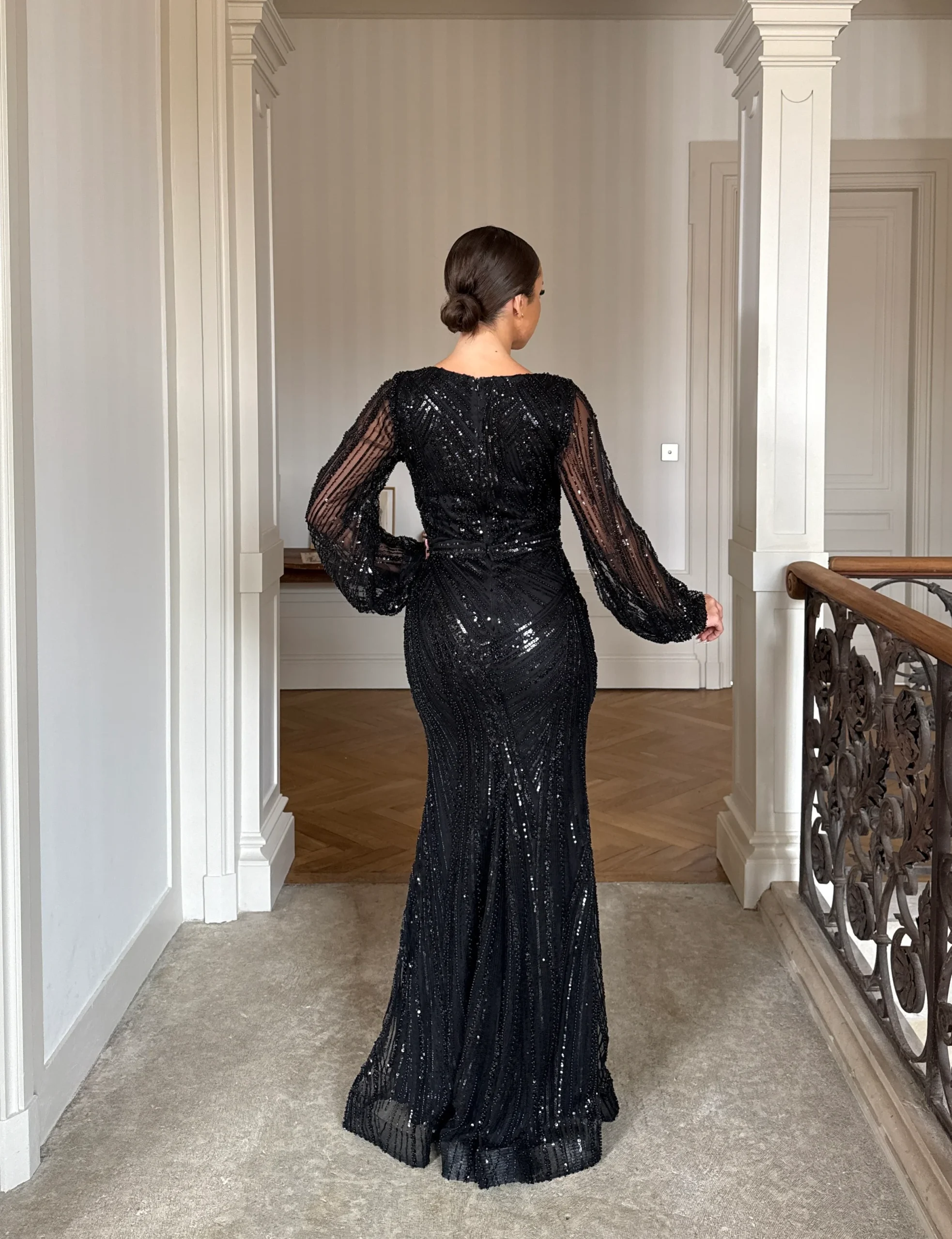Cette longue robe de soirée noir élégante se distingue par ses finitions soignées et ses détails élégants. En effet, les manches longues transparentes légèrement bouffantes, délicatement ornées de sequins brillants, apportent une touche glamour tout en restant mesurées. Par ailleurs, le col carré met subtilement en valeur le port de tête et le décolleté avec beaucoup de finesse. Contrairement à certains modèles, cette robe est conçue sans fente, garantissant une allure fluide, gracieuse et parfaitement sophistiquée.