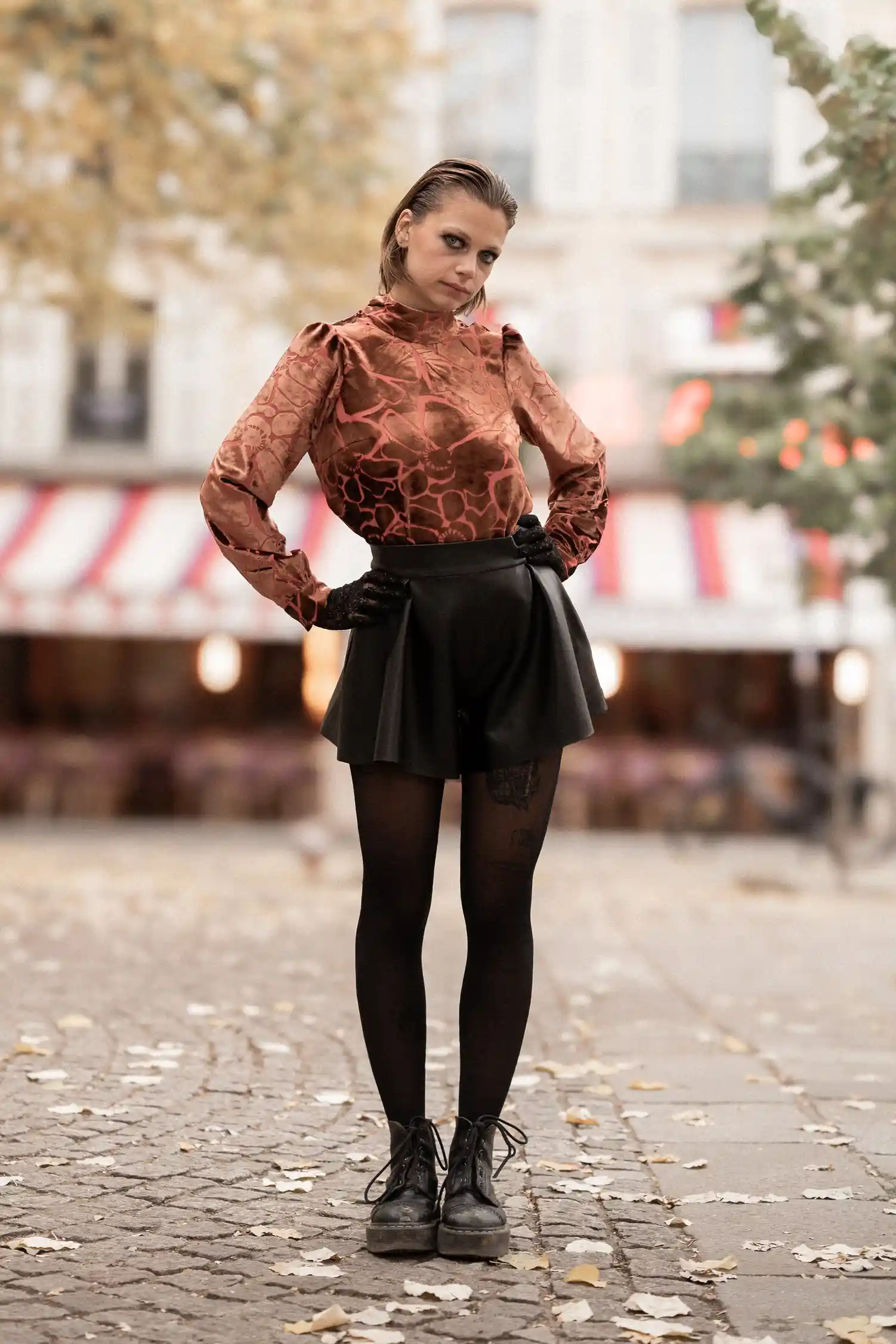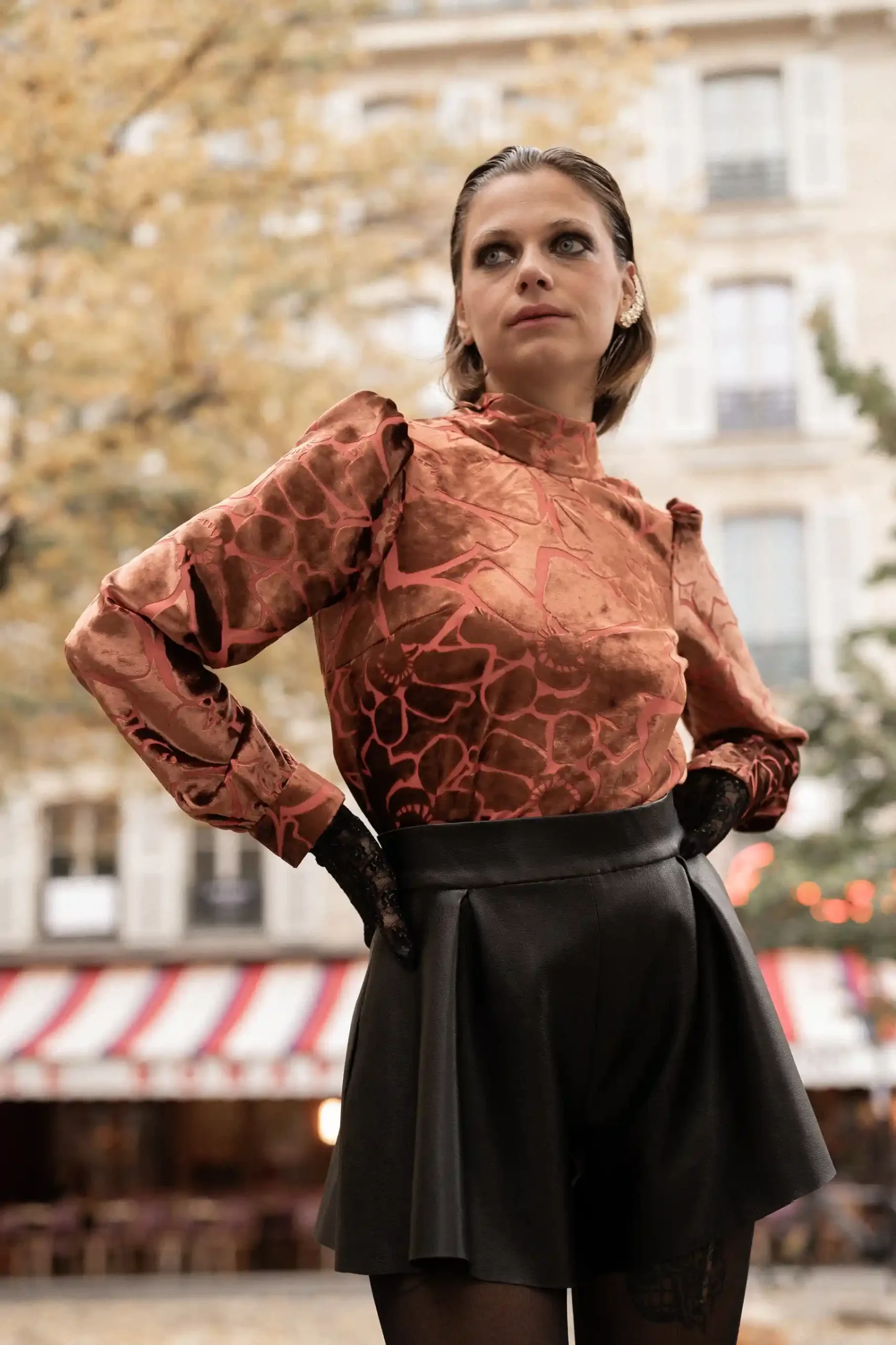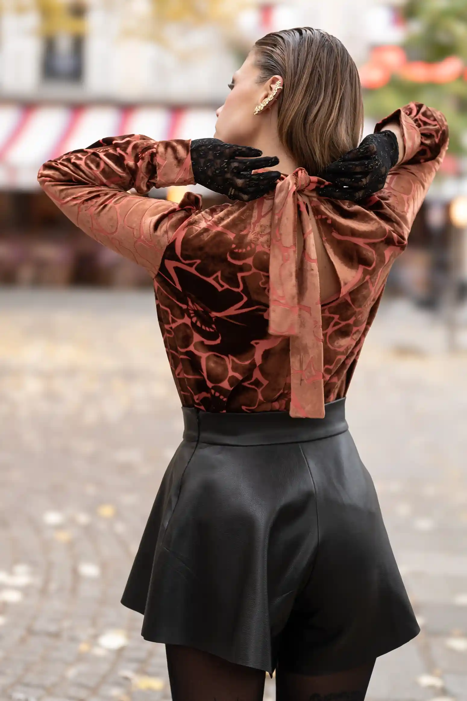 Sublimez vos tenues de fêtes avec cette blouse col montant nouée au dos, confectionnée dans un somptueux tissu velours dévoré de soie. Ses manches longues légèrement bouffantes ajoutent une touche d’élégance et de sophistication, tandis que le jeu de transparence de son motif unique capte la lumière pour un effet féerique. L’ouverture délicate dans le dos, ornée d’un nœud raffiné, apporte une allure féminine et moderne.