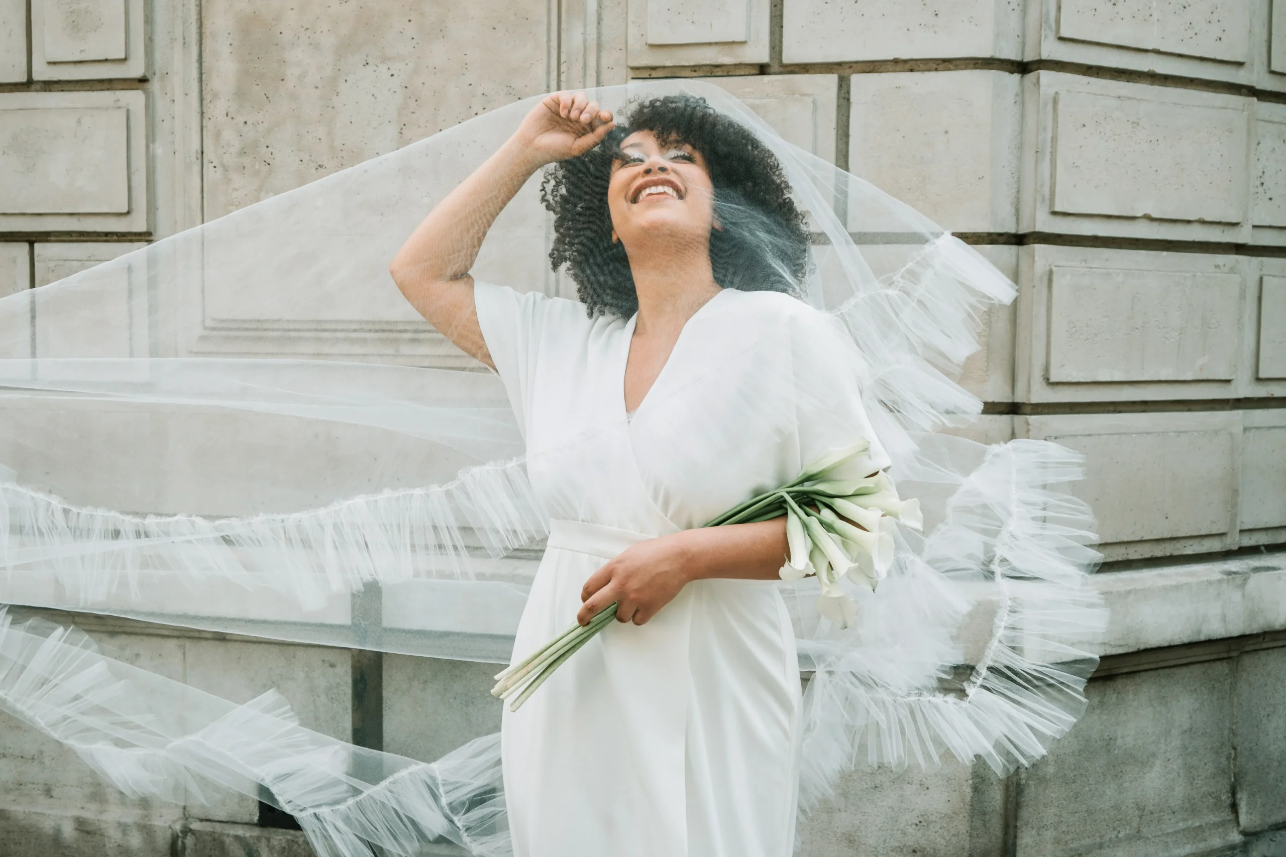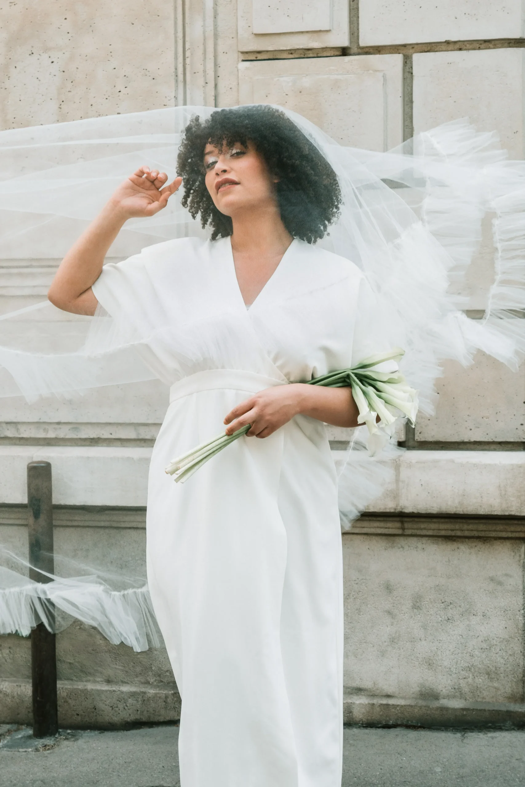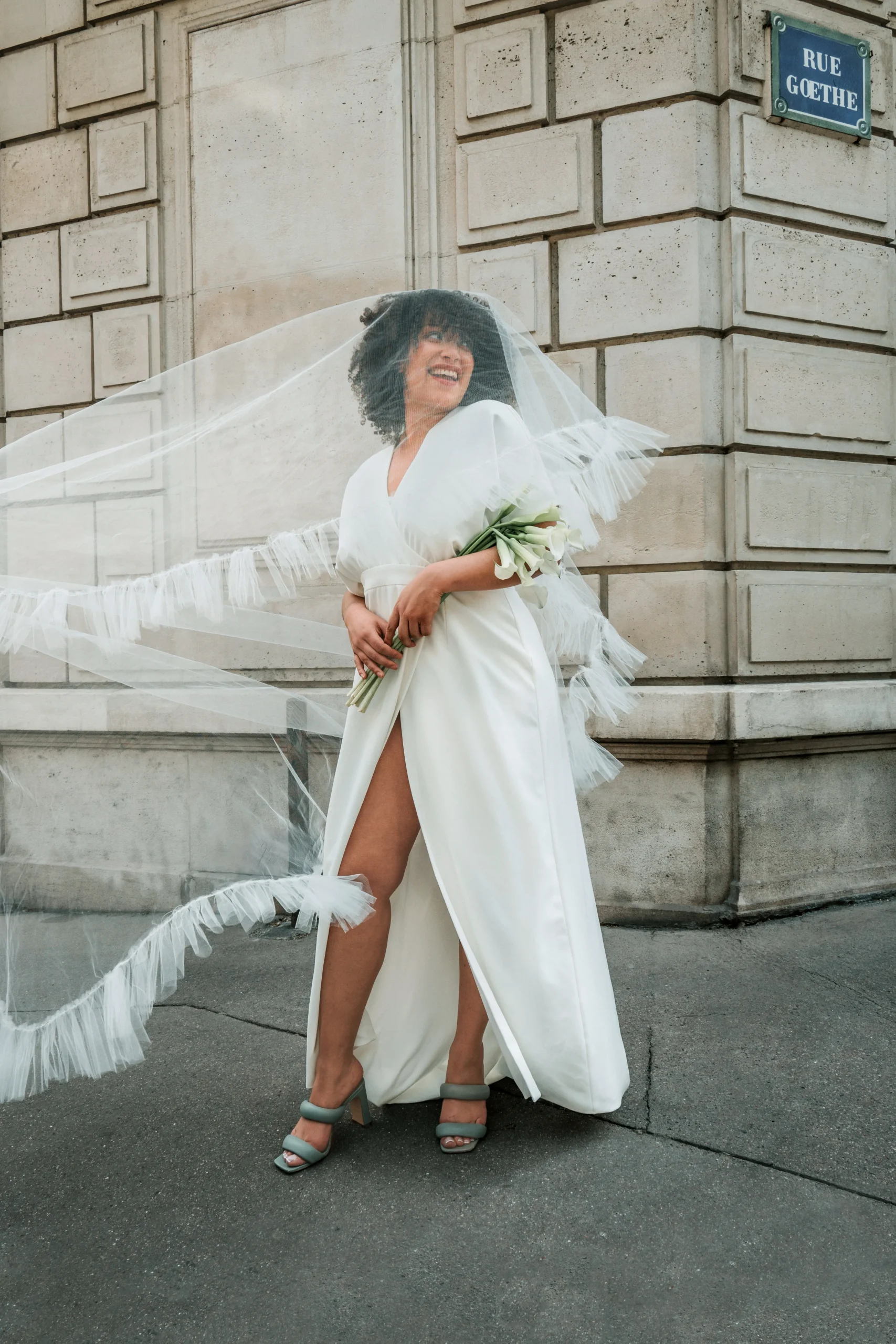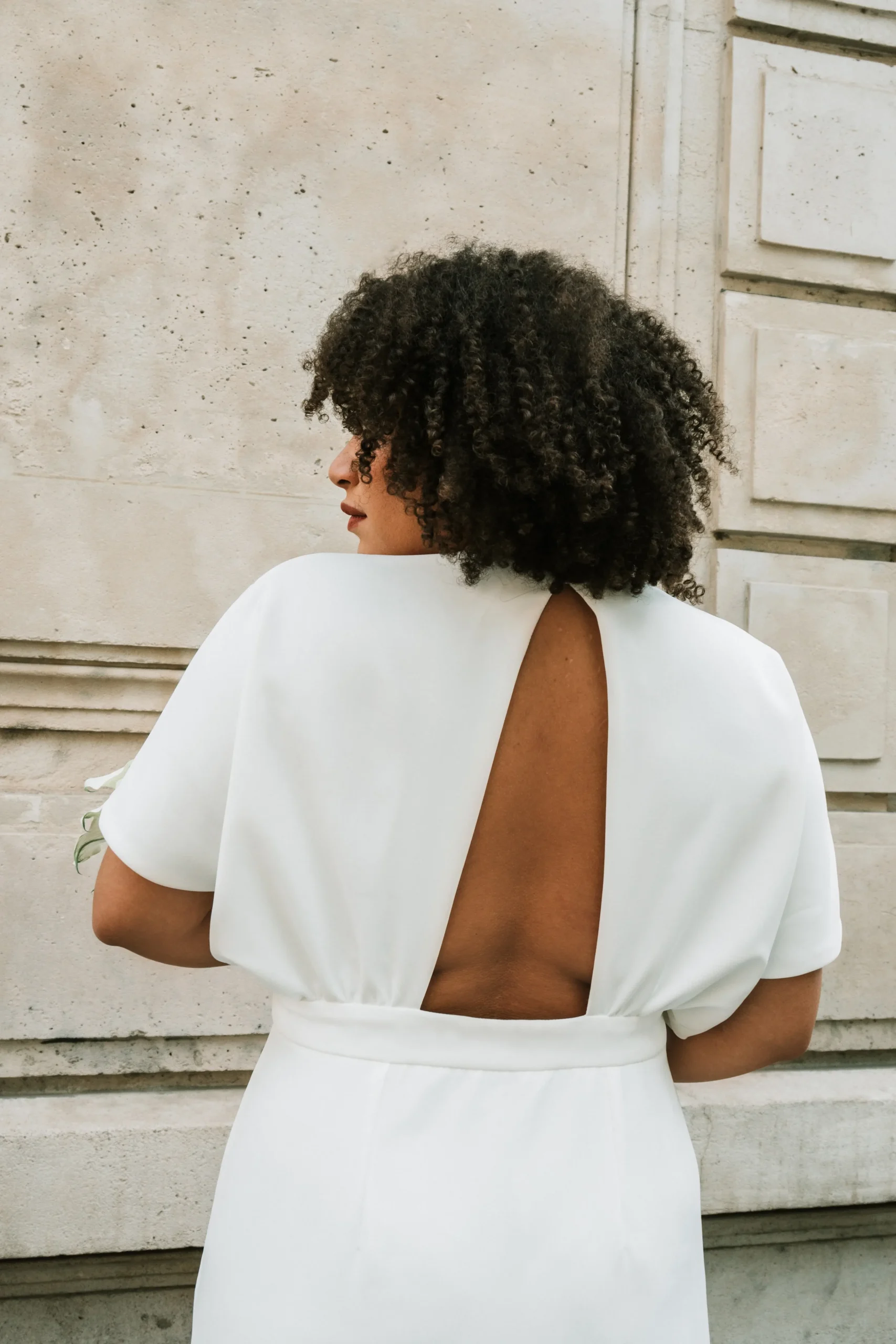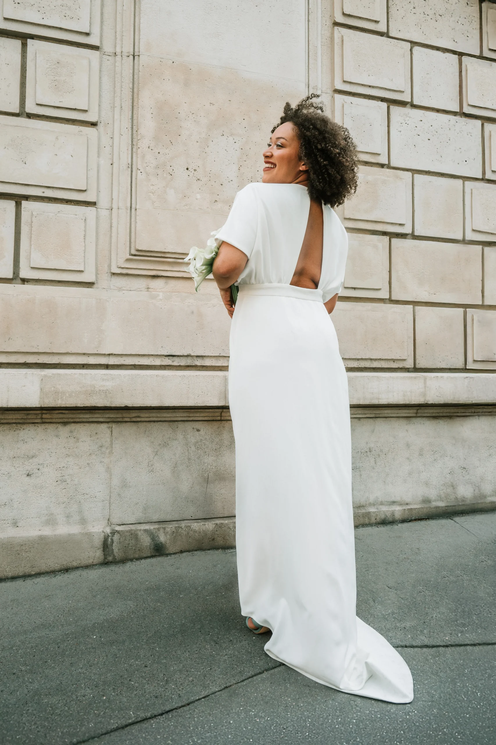 Robe longue avec traine, forme cache-coeur, boutonnée devant, manches chauve-souris et dos nu.