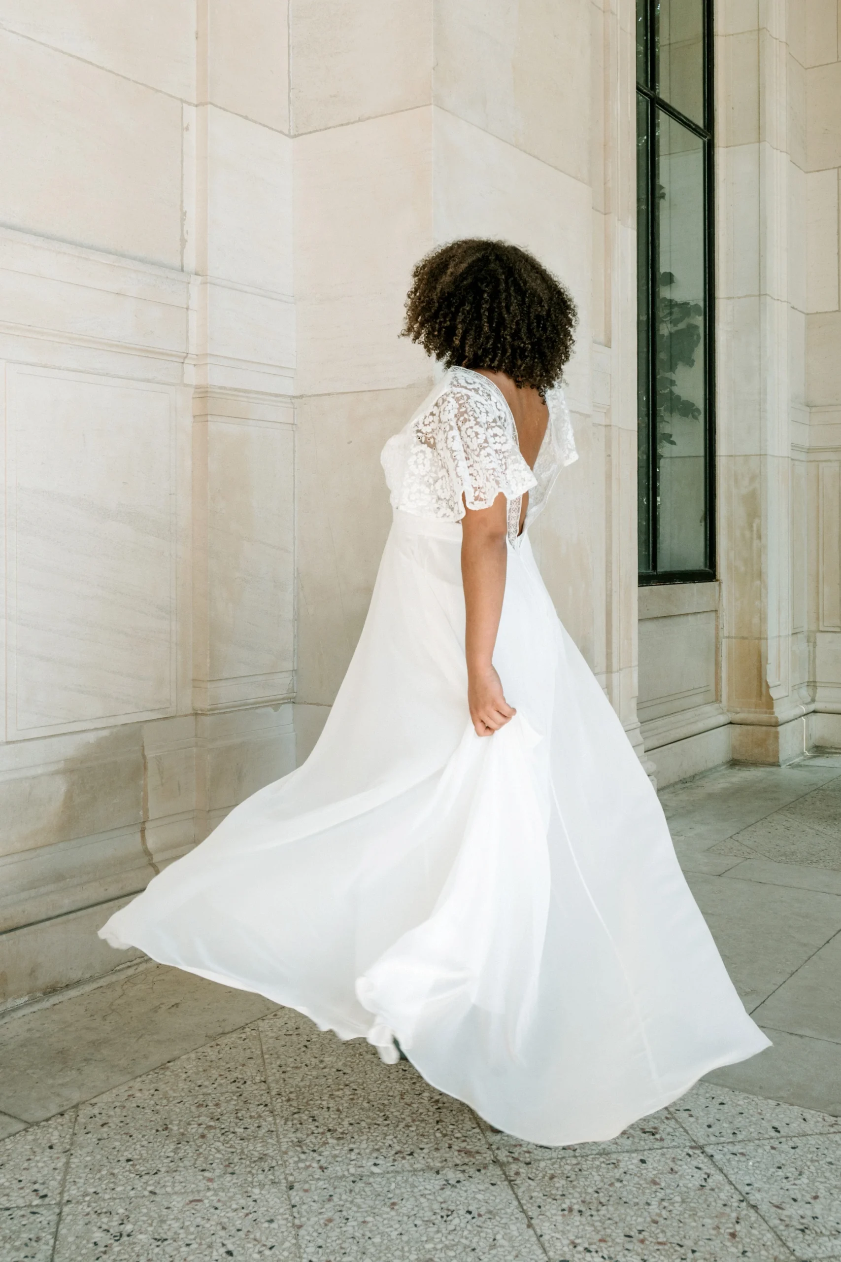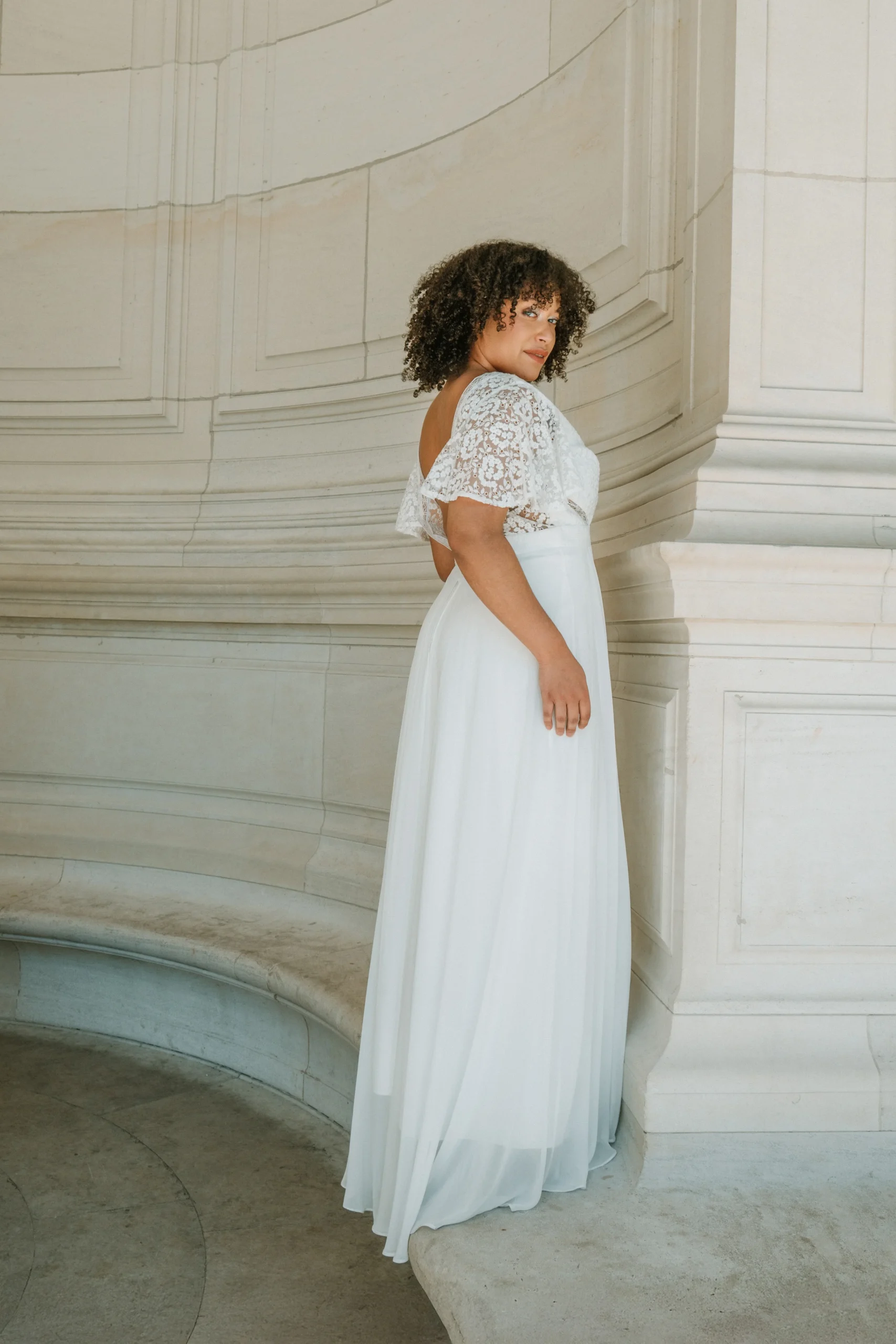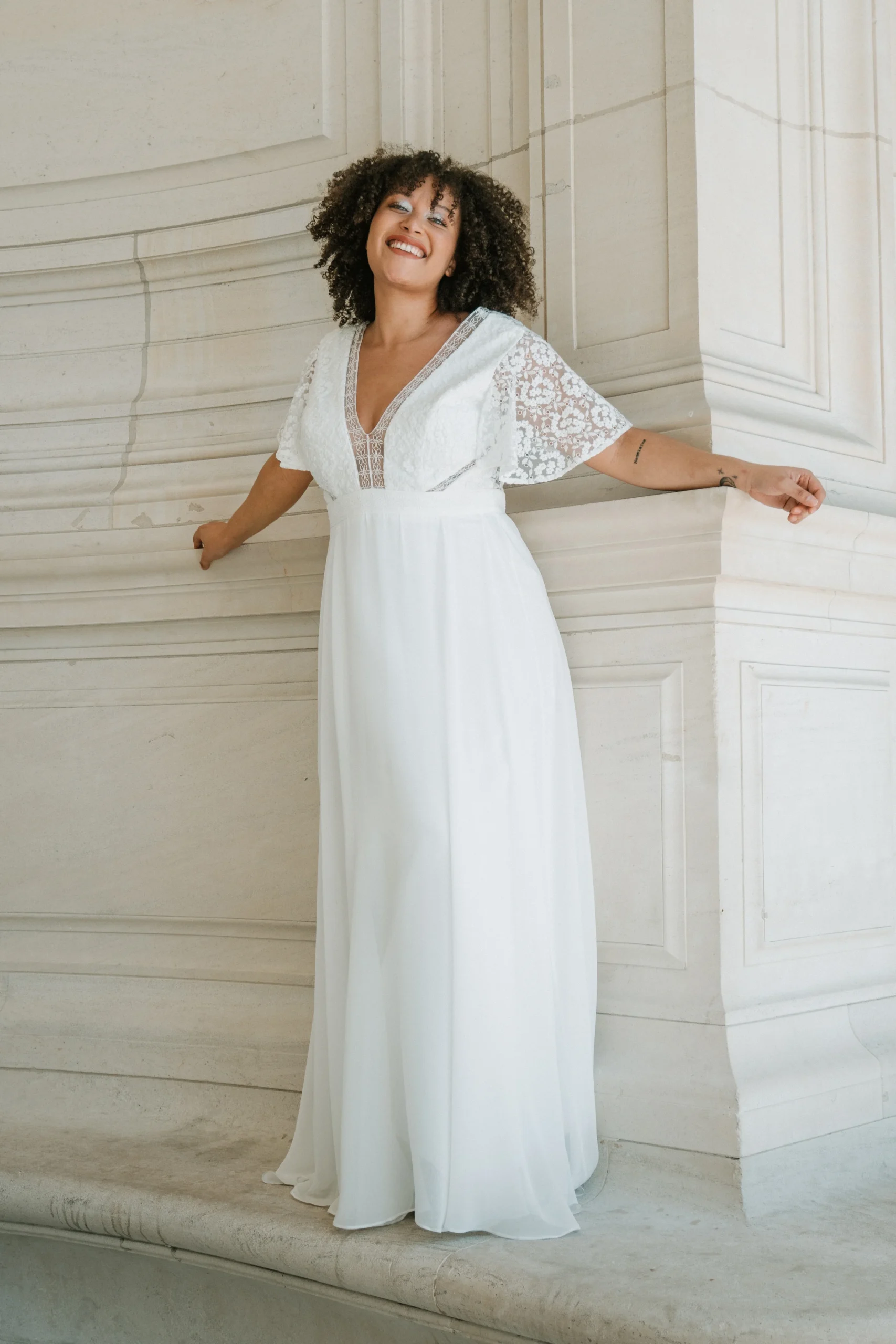 Robe longue avec sa jupe vaporeuse et sa petite traine en mousseline, son top en tulle brodé avec un jeu de galon soulignant les décolletés devant et dos extra plongeants. Petit plus avec ses manches volantes en tulle brodé qui soulignent la silhouette dessinée par la robe.