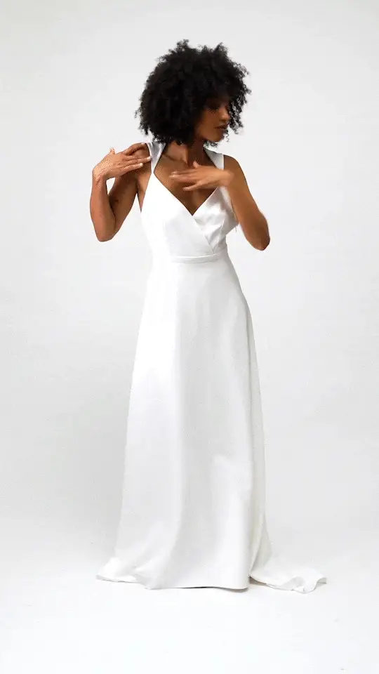 Ensemble robe longue en crêpe et son crop top transparent en tulle brodé. Robe joliment évasée, avec traine, haut cache coeur, découpe géométrique aux épaules et au dos pour un esprit résolument moderne. Top transparent, manches papillon en tulle brodé à la main d’un dégradé de petites fleurs.