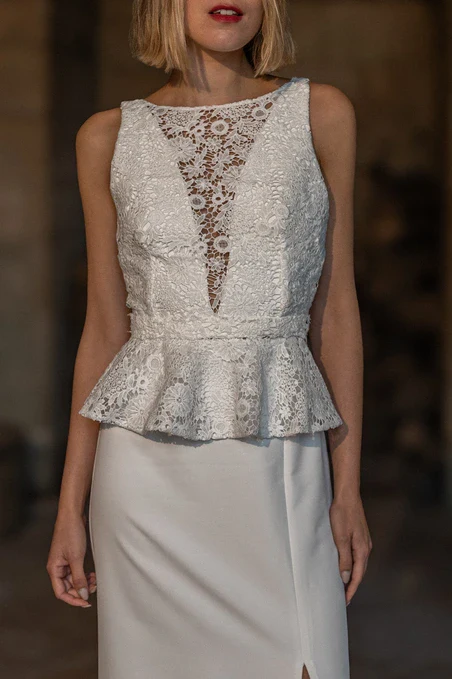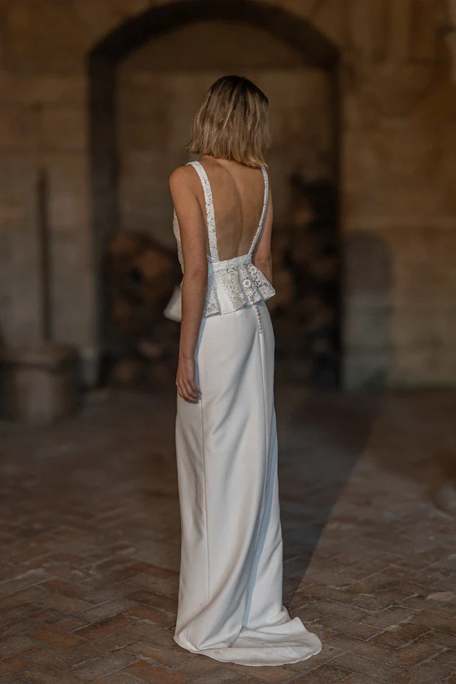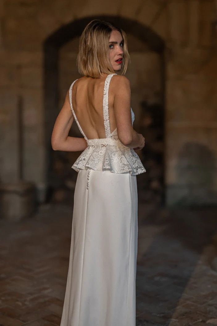 Robe de mariée élégante et moderne signée est confectionnée en guipure et crêpe de soie ou polyester. Le top style peplum ajoute une touche sophistiquée à cette robe, structurant la silhouette avec grâce. Le devant présente un détail en guipure ajourée qui met en valeur le décolleté tout en conservant une allure subtile et délicate.