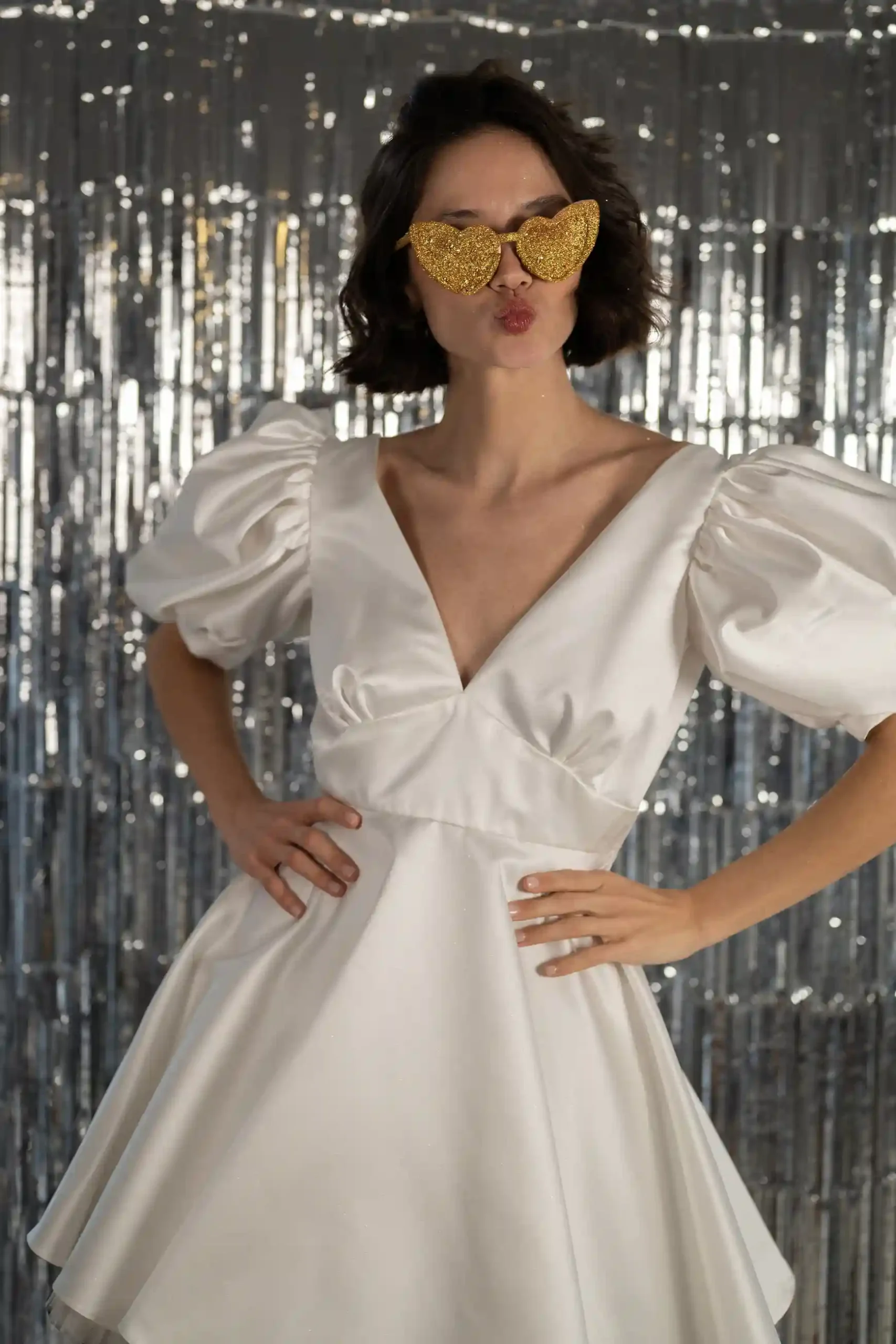 Pour un mariage civil aussi chic qu’inoubliable, laissez-vous séduire par cette robe de mariée courte en satin duchesse. Avec son col en V flatteur, son dos nu plongeant et ses manches légèrement ballon, elle incarne parfaitement l’équilibre entre modernité et romantisme. Idéale comme robe de cérémonie ou robe de mariée civile, elle s’adapte à toutes vos envies grâce à son jupon amovible en option, qui vous permet de jouer avec le volume pour un effet saisissant (et pour faire des pirouettes sur la piste de danse) 💃✨