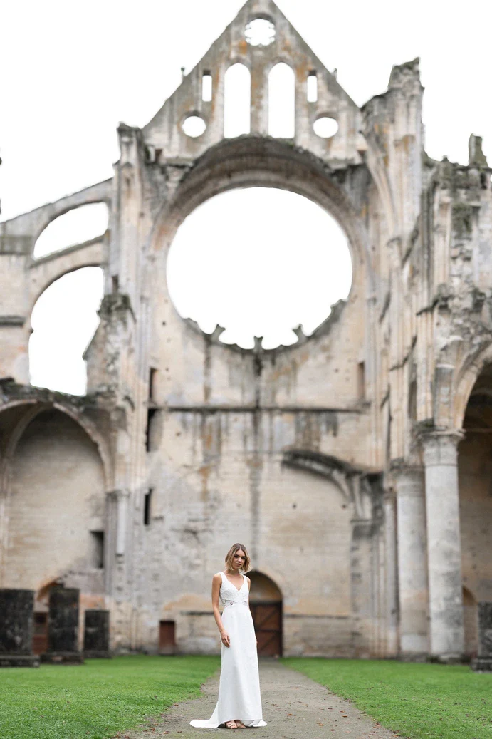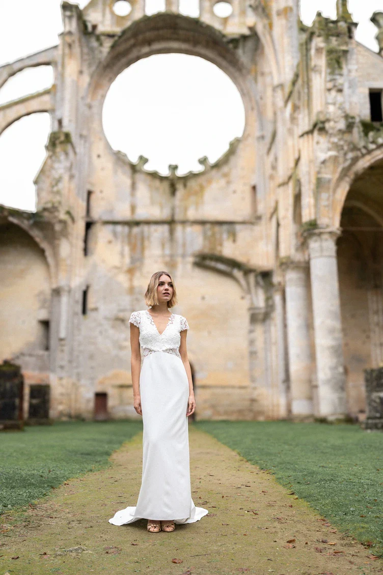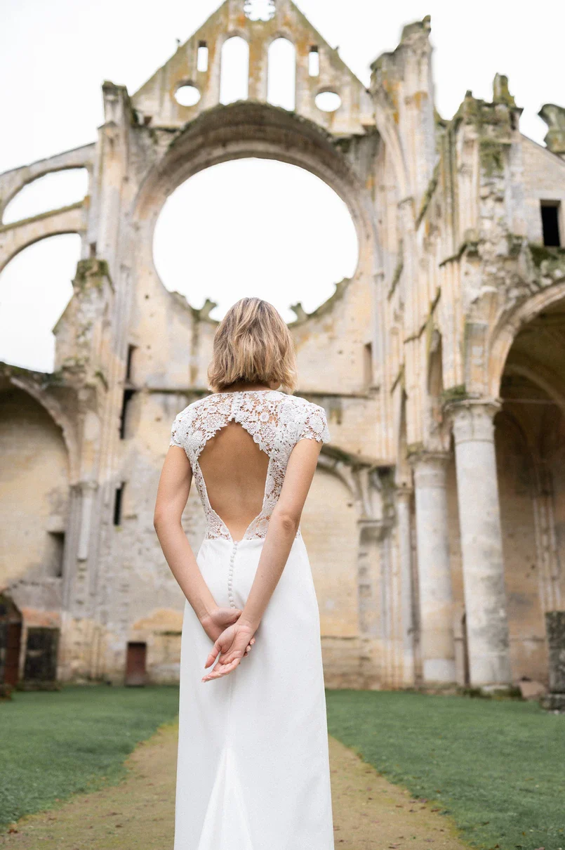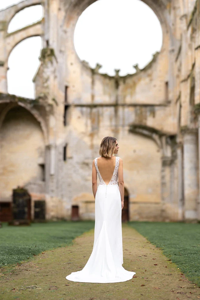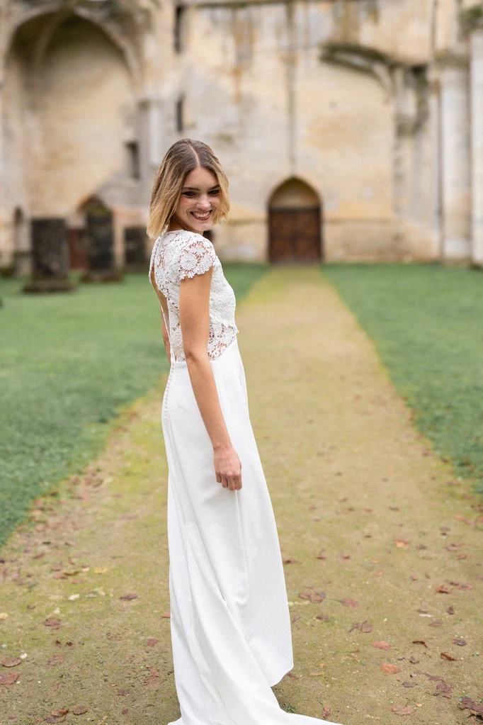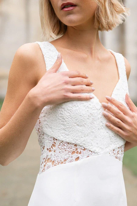 Le top en guipure, délicatement posé sur la robe, est entièrement amovible. Cela permet de révéler un dos nu et un décolleté audacieux, pour un changement de look subtil mais spectaculaire durant la journée ou la soirée. Le bas de la robe, simple et fluide, se termine par une traîne, mettant en valeur le corps et les mouvements.