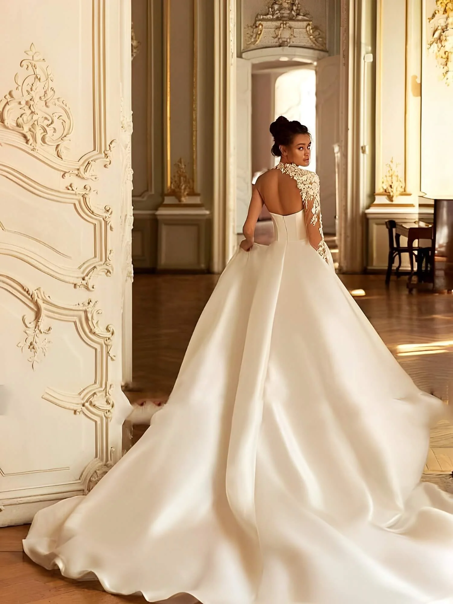 La combinaison du satin et de la dentelle crée un effet visuel captivant, évoquant un mariage entre tradition et modernité. Les détails floraux en dentelle ajoutent une note romantique et délicate à l’ensemble de mariée couleur ivoire, capturant l’essence de la féminité.