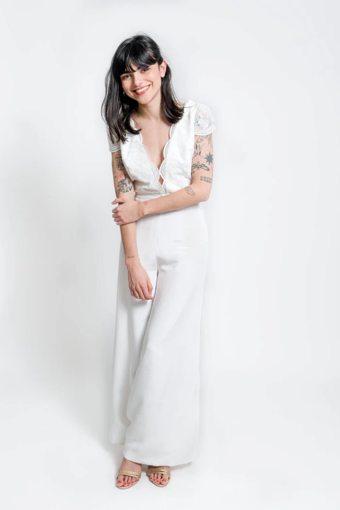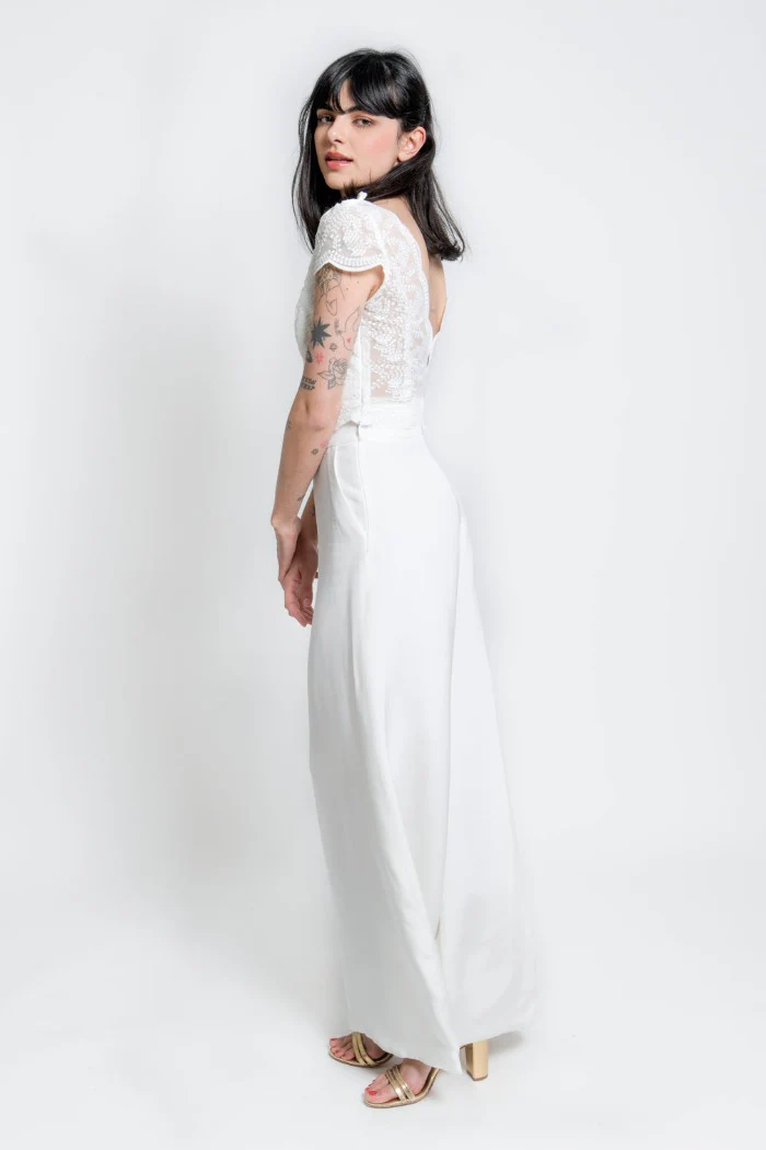 🇫🇷 Fabriqué en France 🇫🇷 – à partir de 750€ ⬇ message alerte ⬇ Description Combinaison pantalon évasé taille haute et haut dentelle, mancherons, décolleté plongeant devant et dos. Tissu : – Crêpe de soie 100%, doublure soie et Tulle brodé – Crêpe de polyester 100%, doublure polyester et Tulle brodé Marie mesure 1,72m et […]