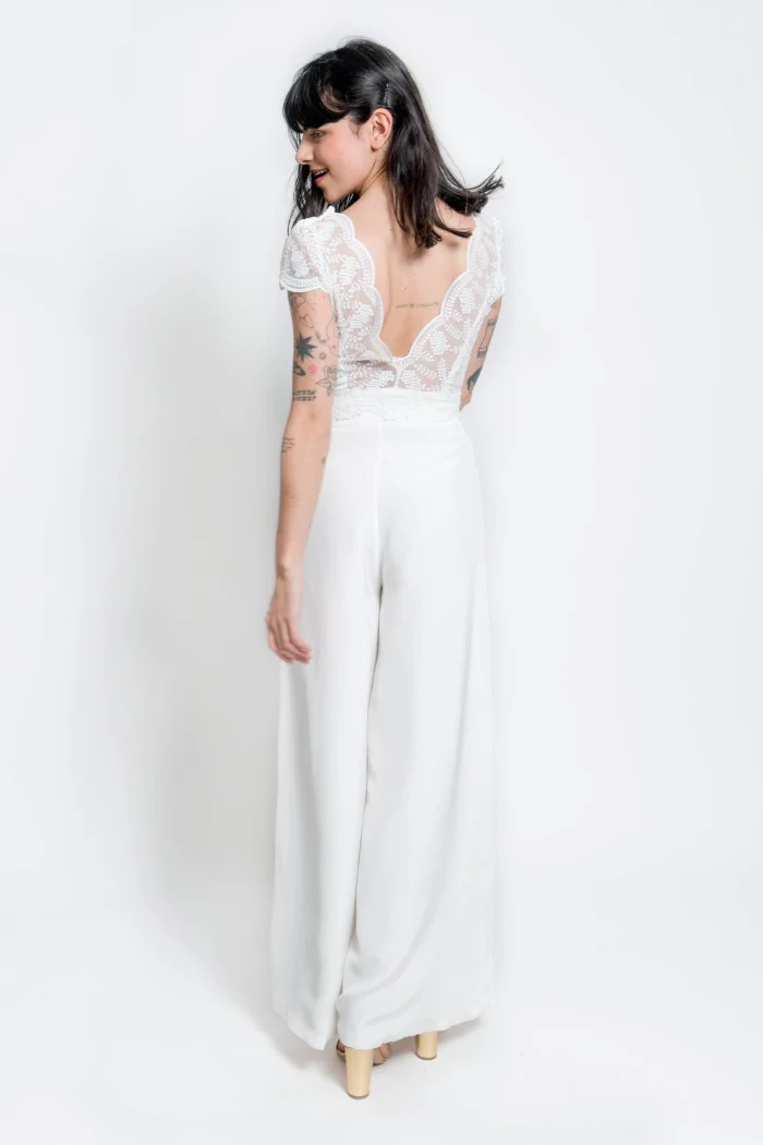 Combinaison pantalon évasé taille haute et haut dentelle, mancherons, décolleté plongeant devant et dos.