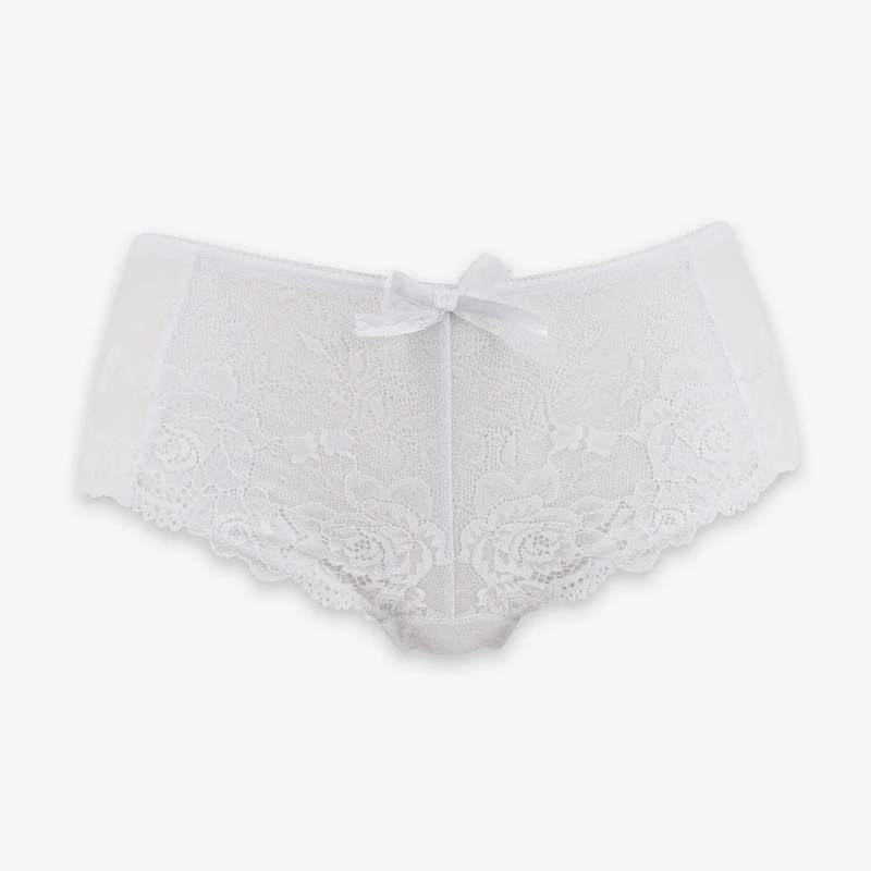 Tout en dentelle, doublée de tulle stretch pour limiter la transparence. Élastique à picots à la taille. Tour de cuisse bordé par l’écaille de la dentelle.