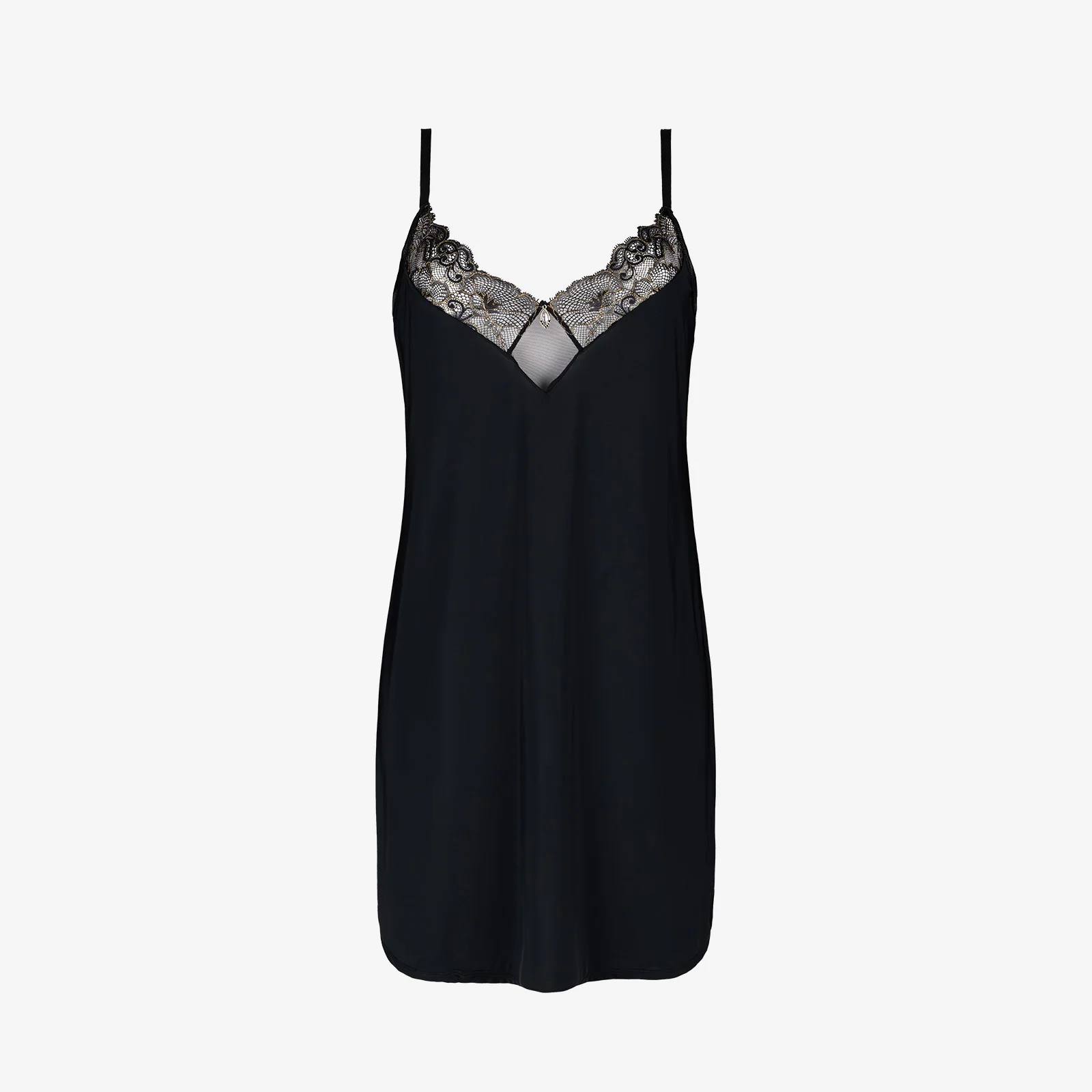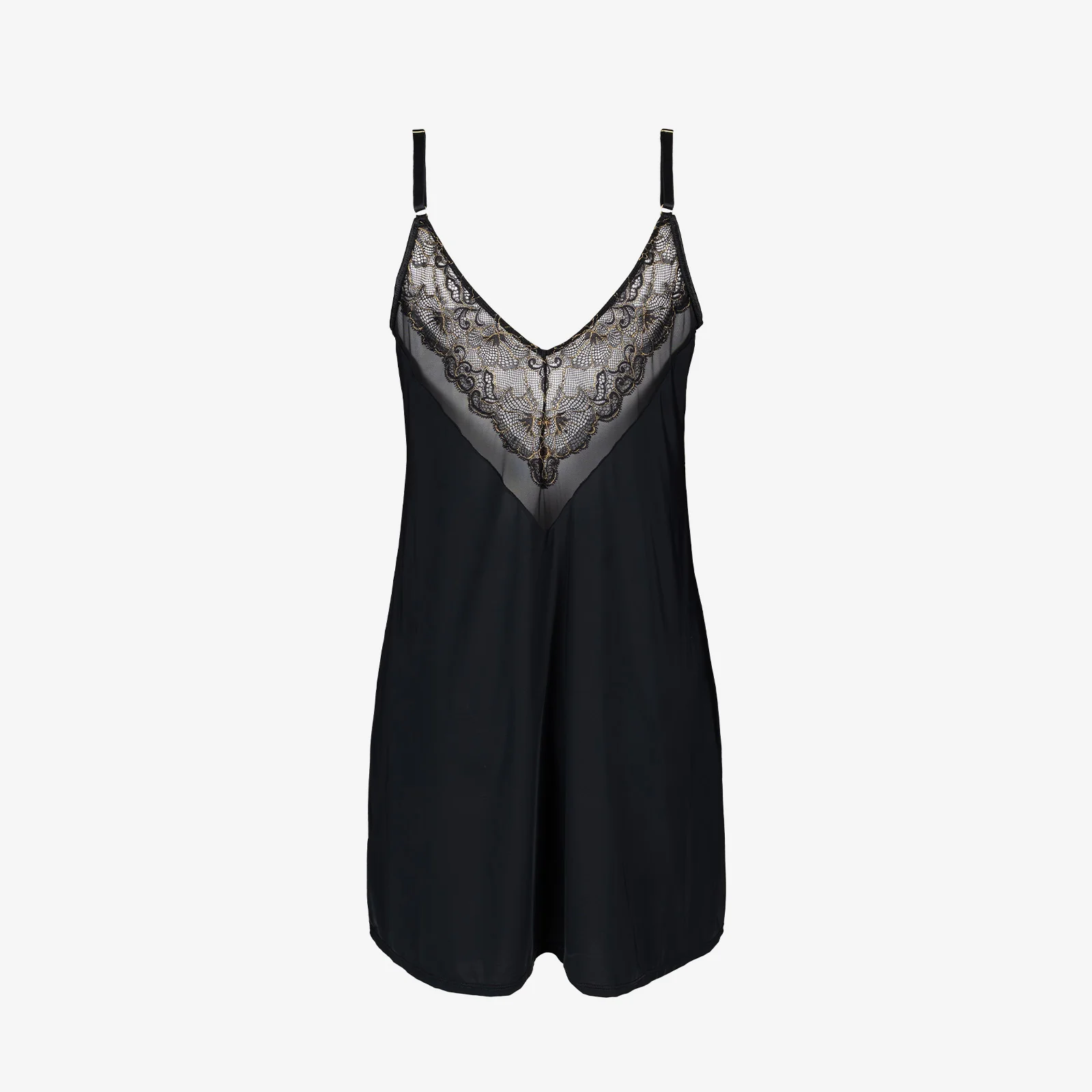 Guide des tailles Ouvrir le guide des tailles Description Coupe droite légèrement évasée en bas Décolleté devant en V bordé par les écailles de la dentelle Empiècement en tulle rigide rehaussé d’un bijou doré serti de strass Devant et Dos en maille lycra satinée Décolleté dos plongeant en tulle lycra souligné par un empiècement en […]