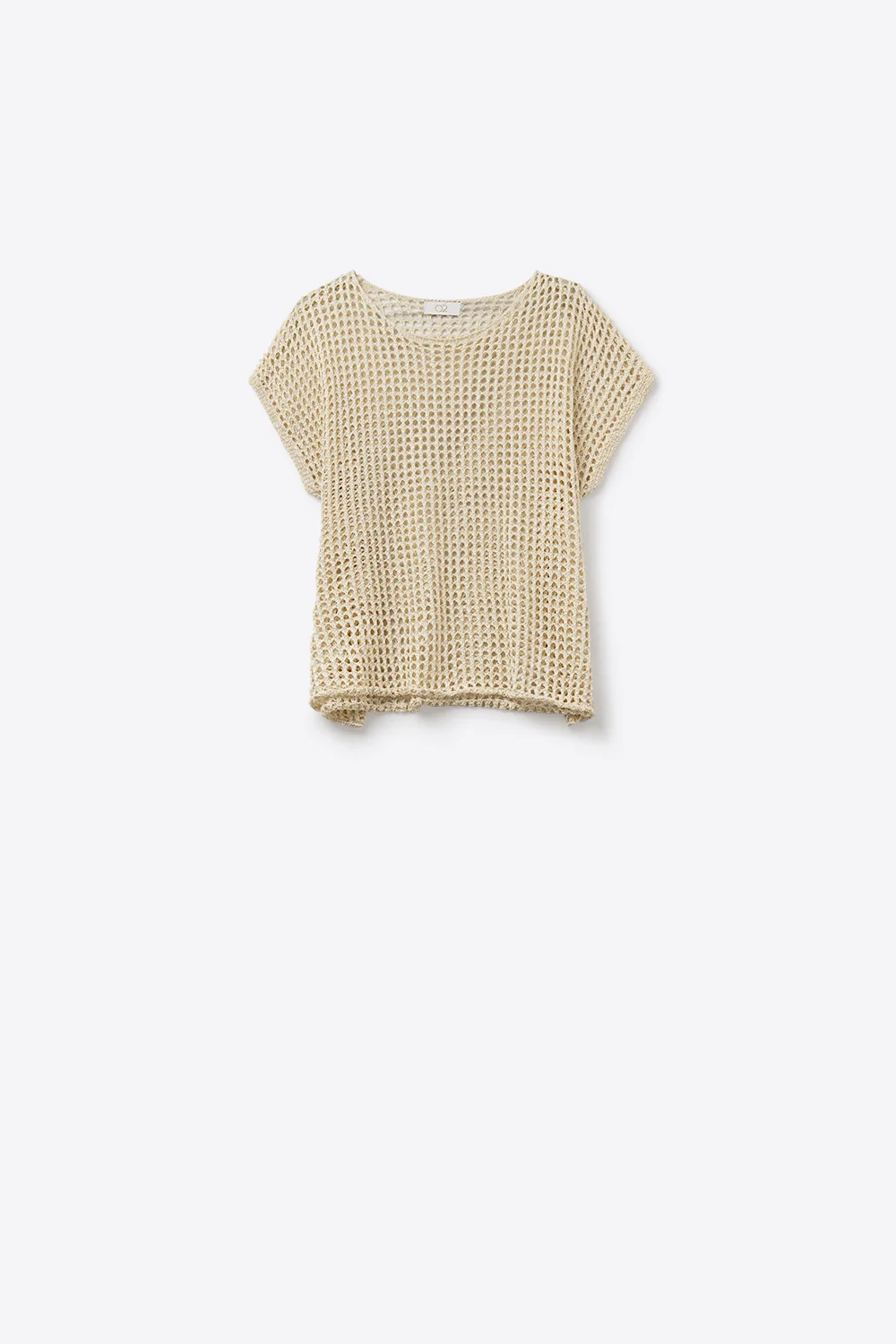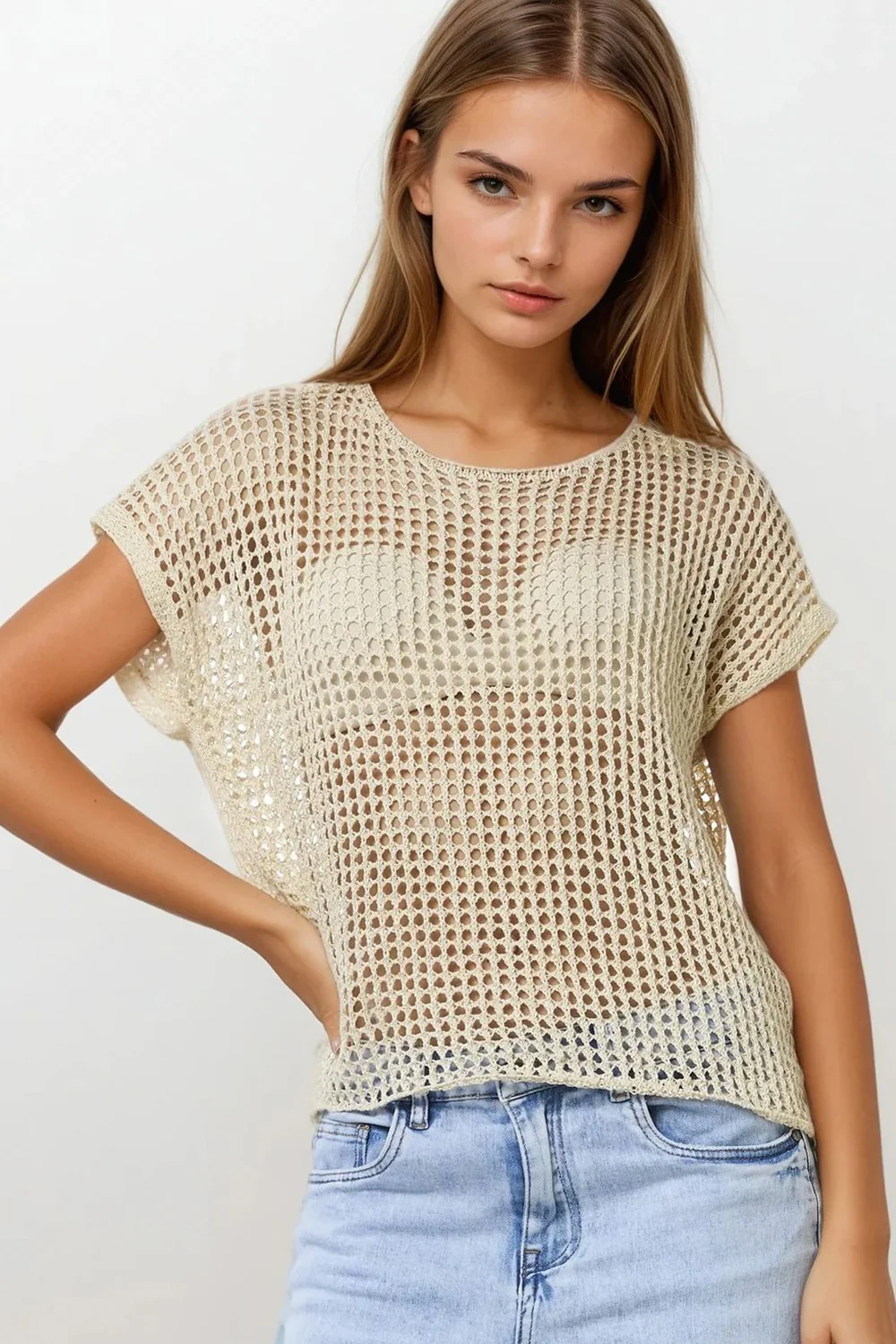 Open Knit Crochet dropped Sleeved Top in Beige