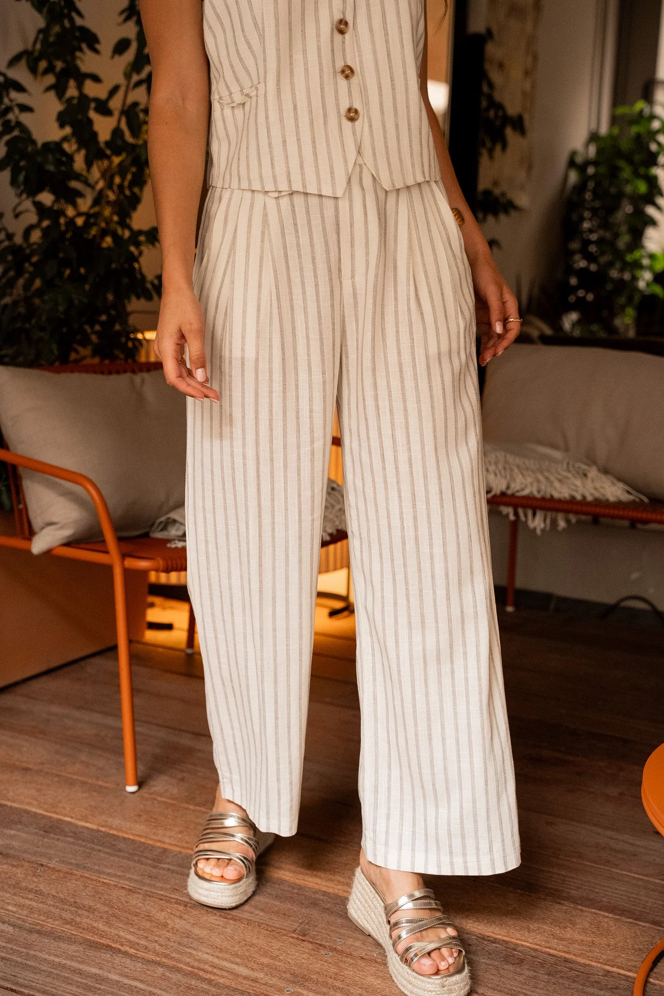 Un pantalon en lin ample avec un gilet assorti pour un look décontracté et confortable. Égayez votre garde-robe avec cet ensemble qui allie style et confort en toute simplicité. Parfait pour toutes les occasions !