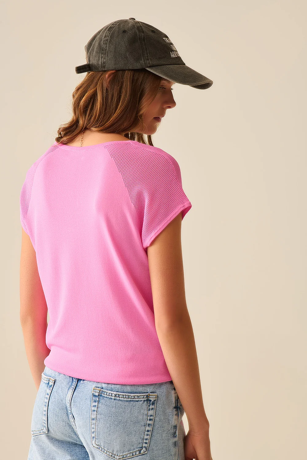 Pull à manches courtes fuchsia avec maille sur l’épaule
