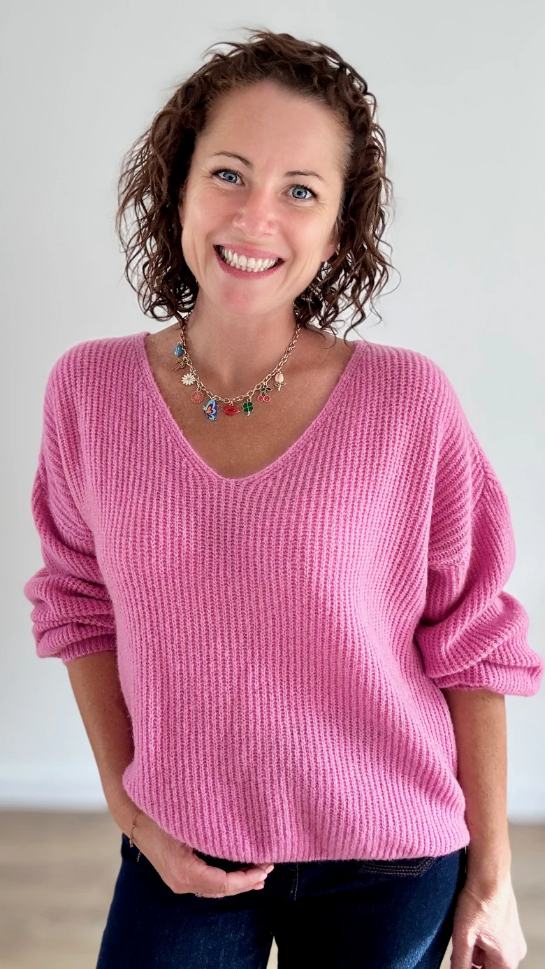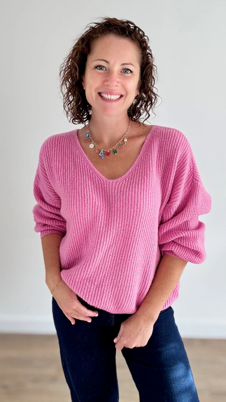Le col V délicat ajoute une touche féminine et moderne, tandis que la teinte rose pep’s, à la fois douce et pleine de caractère, dynamise votre style avec une note joyeuse et tendance.