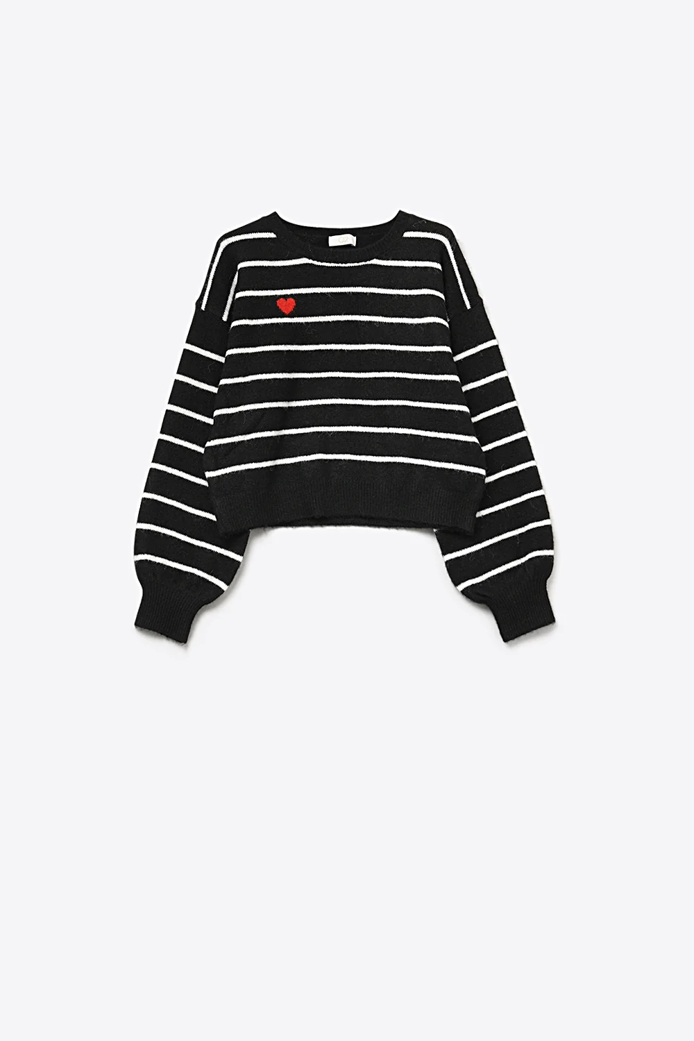 Pull en tricot noir a rayures avec detail de coeur contraste