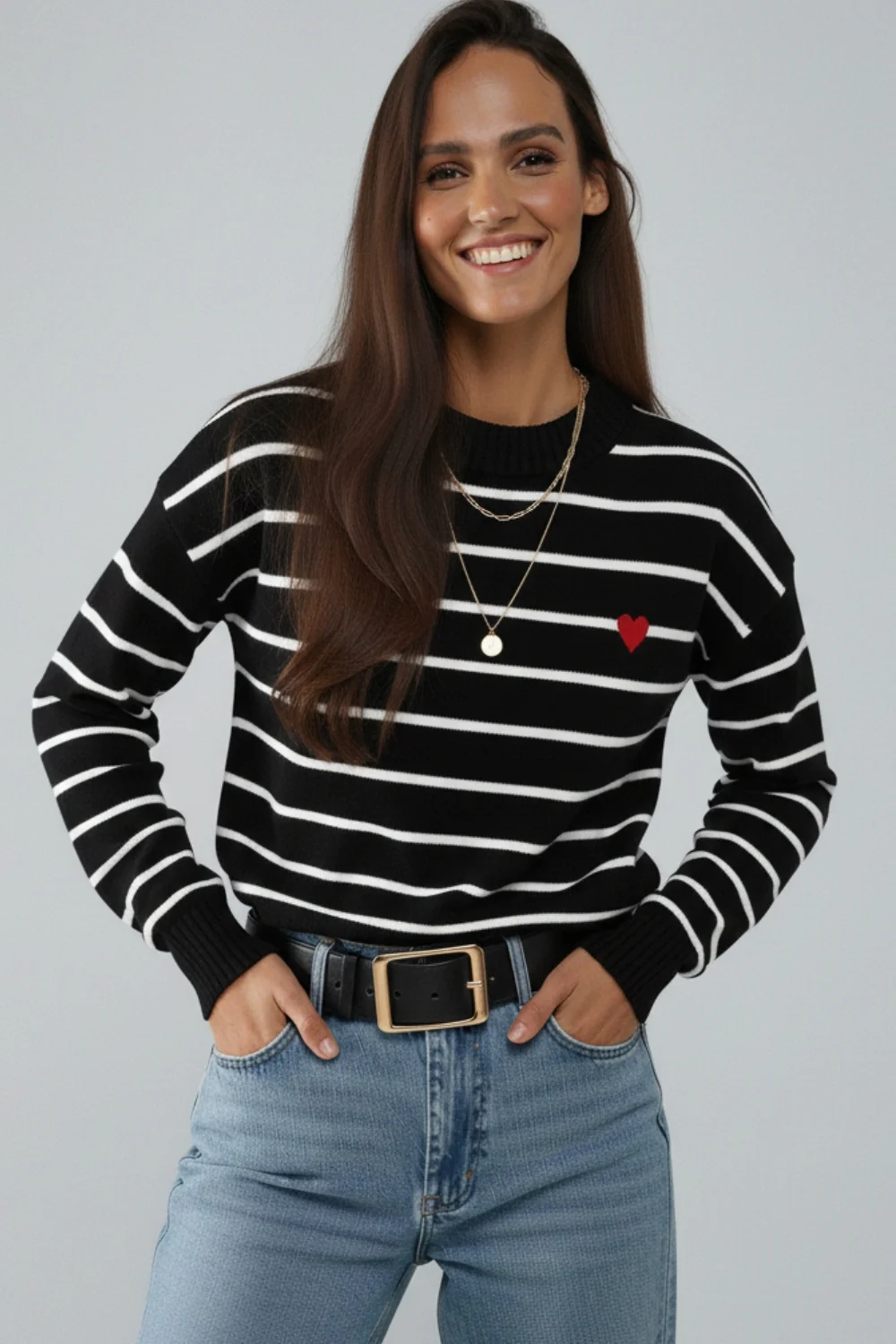 Ce pull en tricot fin combine confort et allure facile grâce à sa coupe décontractée et son motif rayé intemporel. Le détail de cœur contrasté sur le devant apporte une touche graphique maîtrisée, idéale pour dynamiser un look du quotidien sans en faire trop.