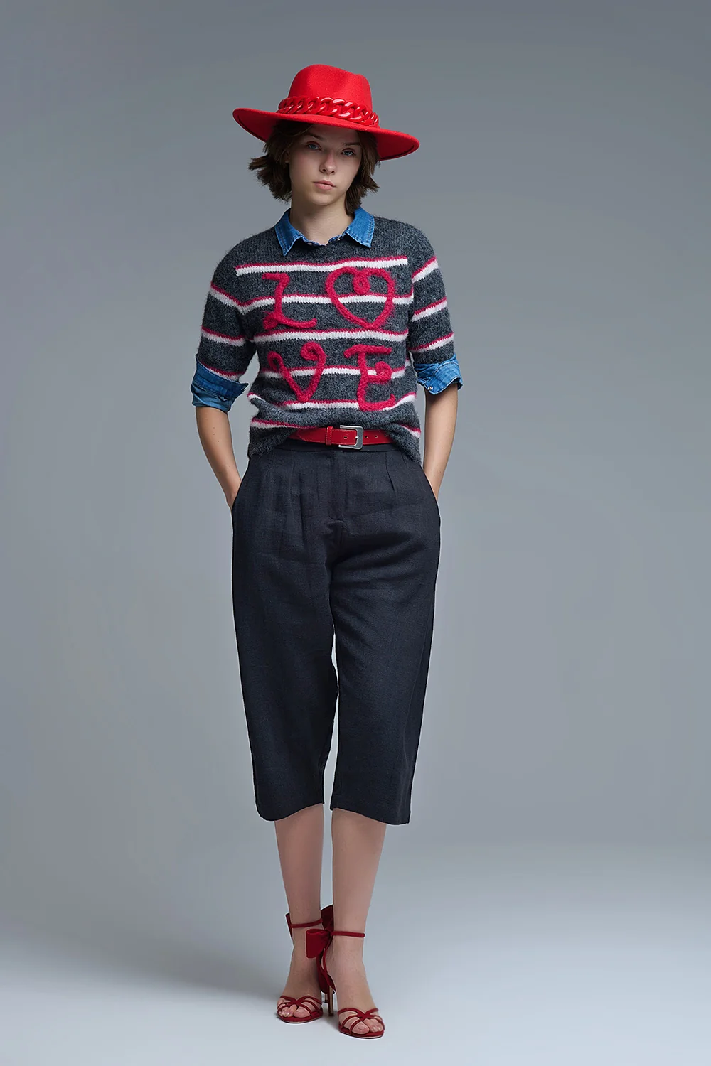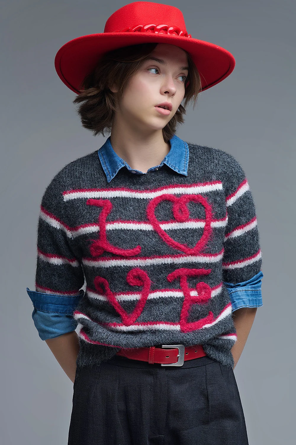 Pull Love brodé à manches courtes en gris foncé