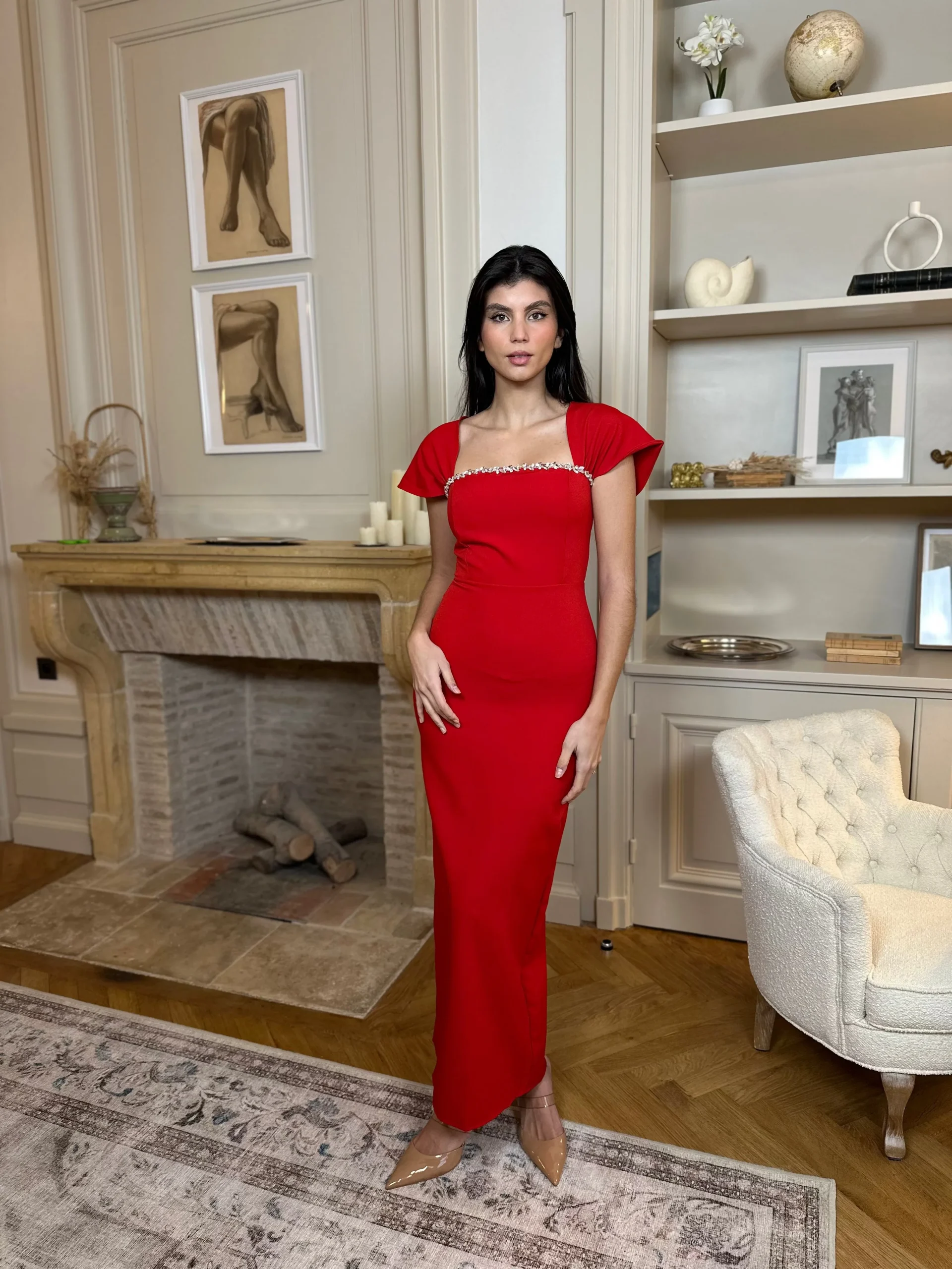 Longue robe de soirée rouge, avec fente à l’arrière.