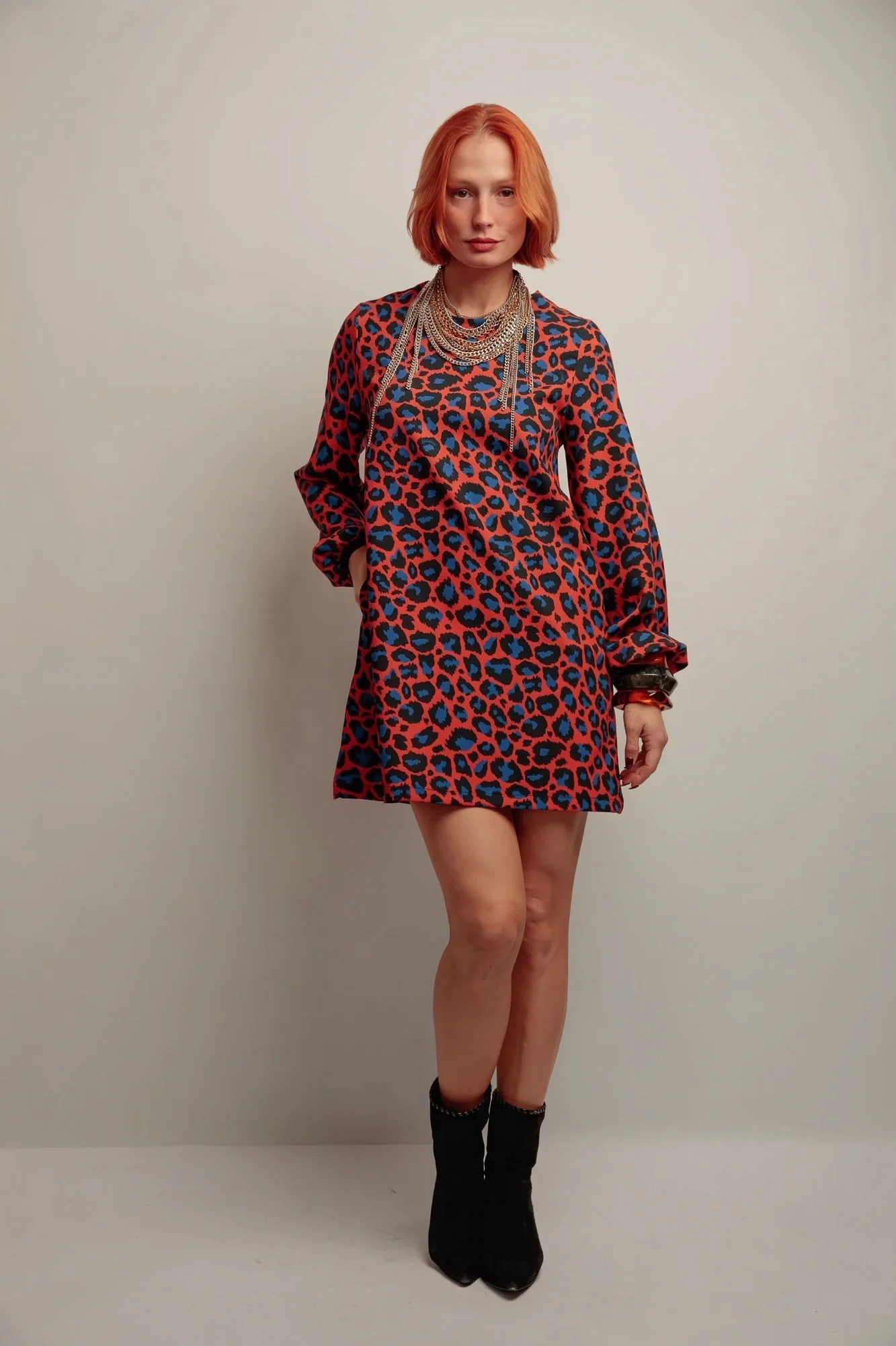 🔹 Détails marquants : Imprimé animal rouille, noir et bleu roi, manches longues bouffantes, poignets en velours noir, poches latérales discrètes