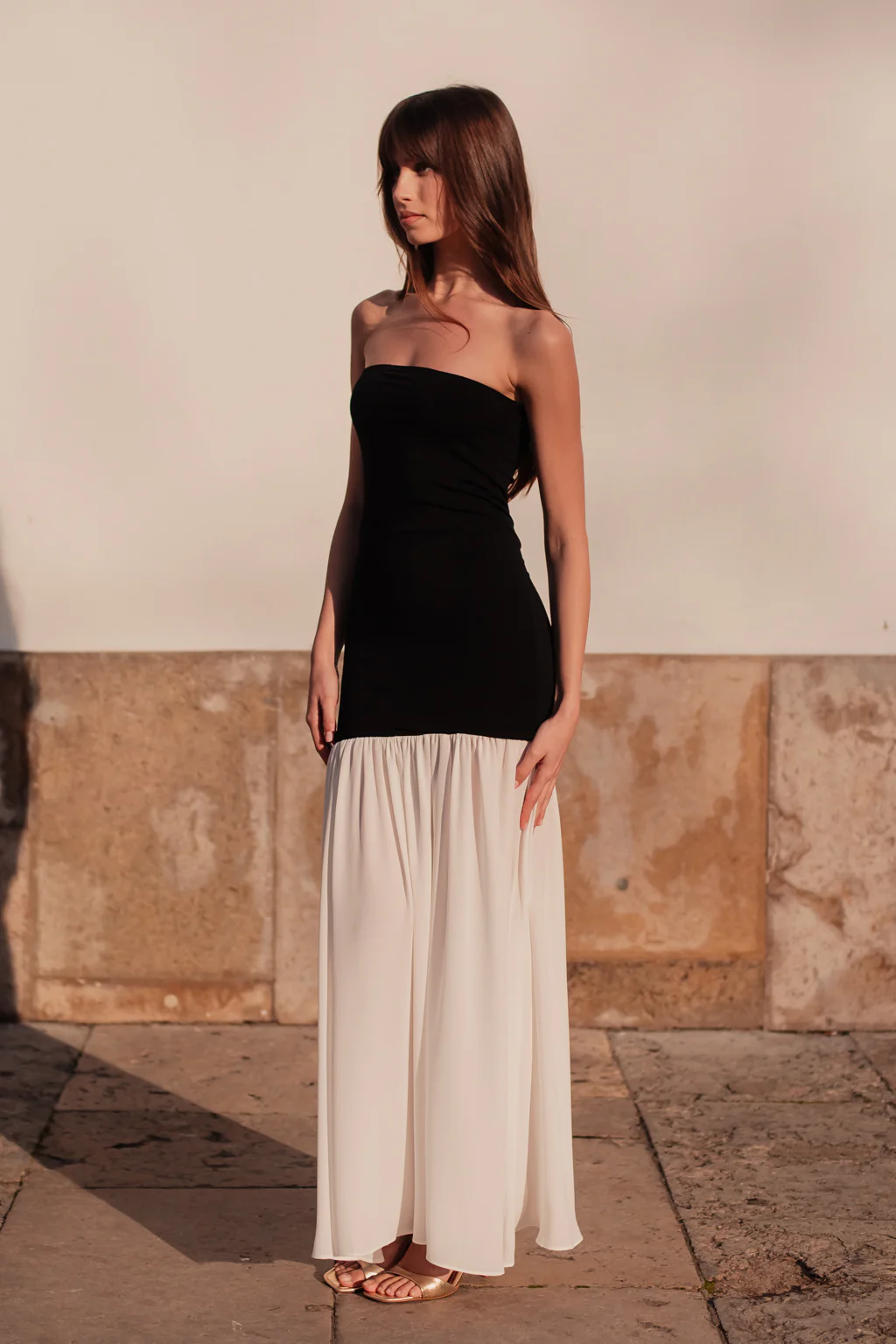 Pardon, mais je ne choisis pas entre structure et fluidité. Bustier sculptant, jupe vaporeuse, noir et blanc contrasté : je fais les règles.
