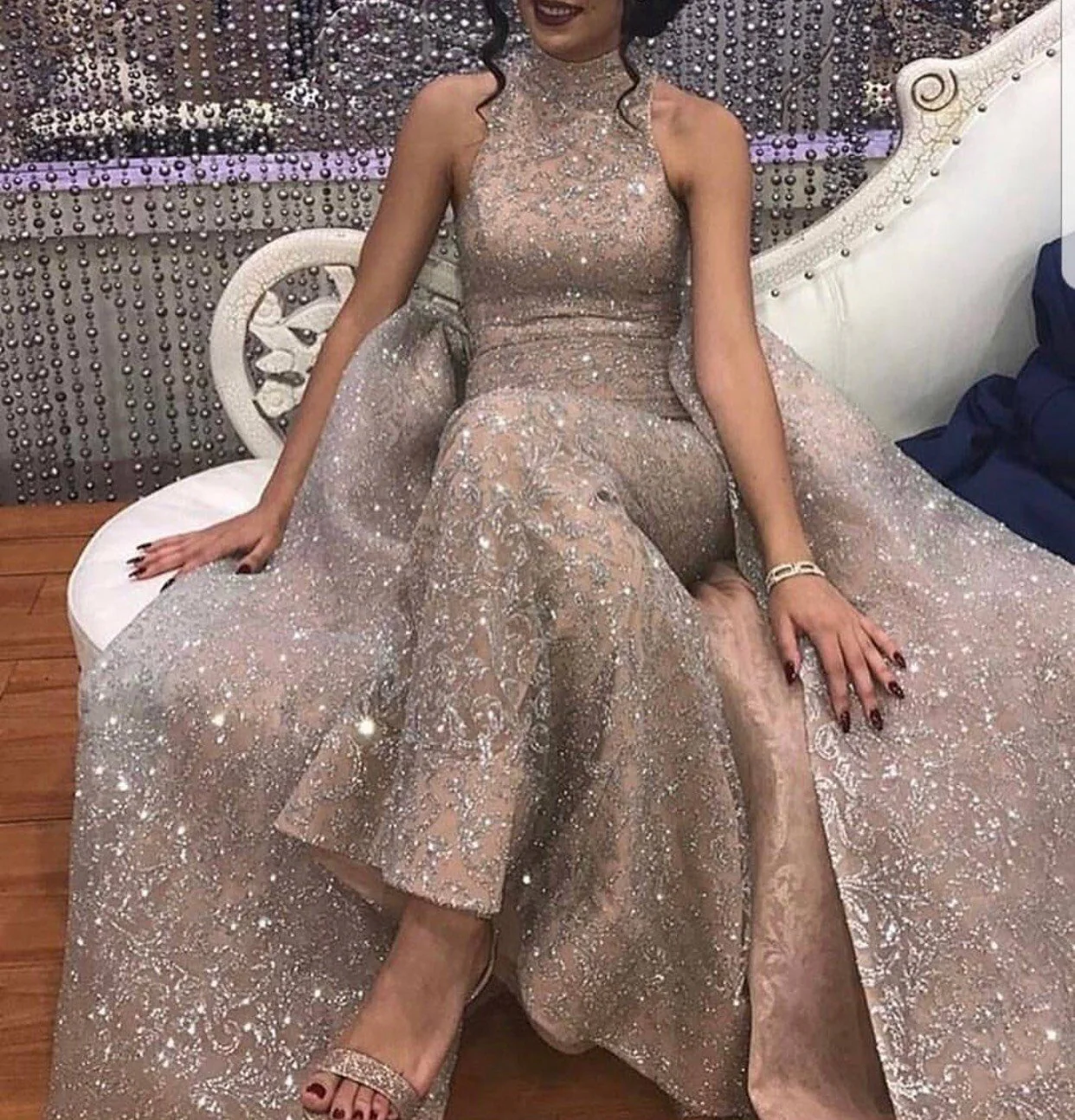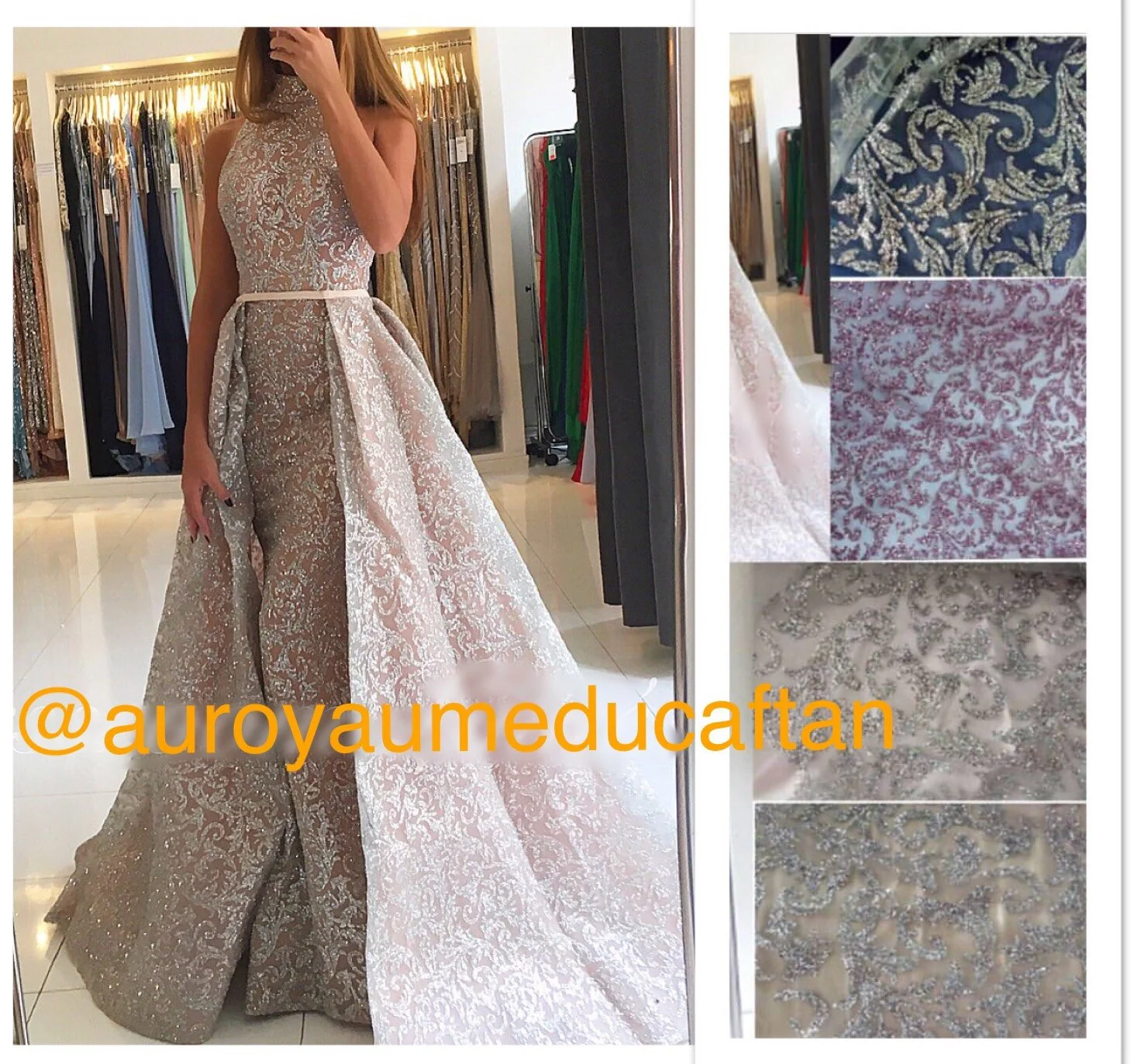 Matière: Tulle épais et motifs en paillette Non transparent Couleur diSpo : beige, dore, prune et bleu Possibilité de rajouter des manches Il suffira de nous l’indiquer lors de la commande Avec les couleurs voulues