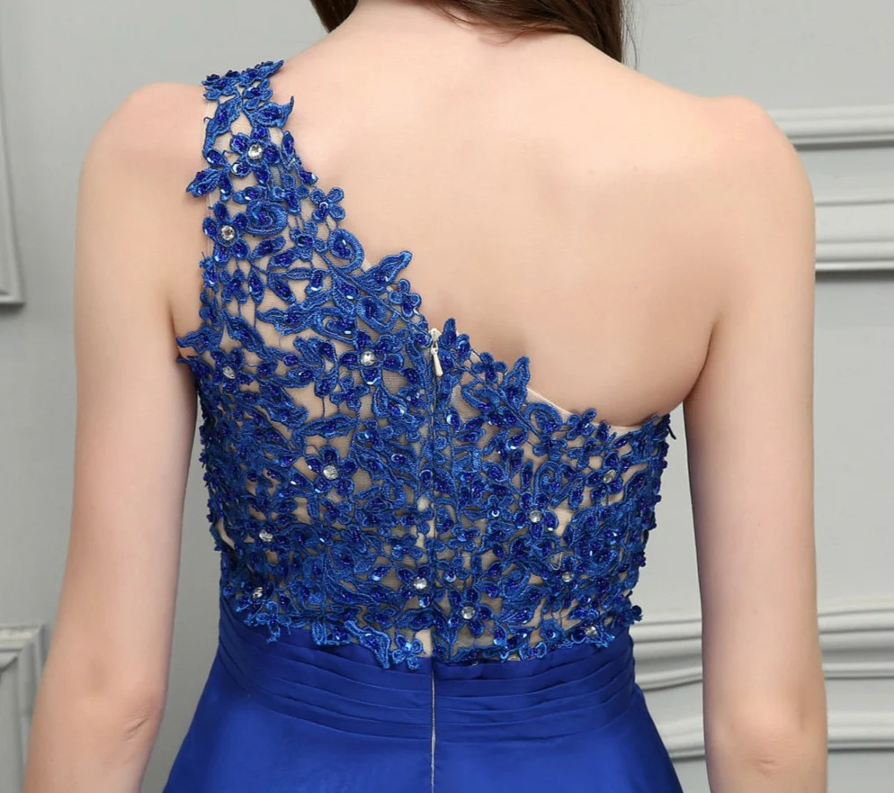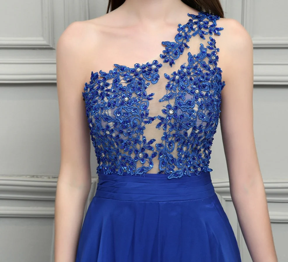 Une Robe Bal de Promo d’exception. Le bustier asymétrique en dentelle révèlera votre féminité avec délicatesse. On aime la fluidité de cette robe en mousseline bleu à porter pour une soirée spéciale.