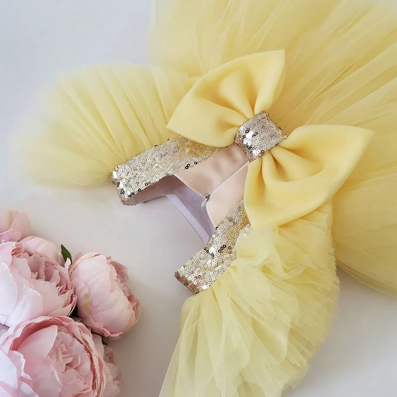 Notre Robe Bébé Princesse en tulle jaune avec un nœud est adorable pour votre petite Princesse.
