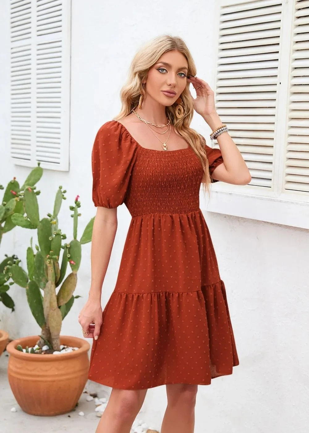 Cette robe ne laisse personne indifférent. Son décolleté carré sublime le buste, tandis que sa taille smockée épouse tes formes avec délicatesse, offrant une silhouette des plus avantageuses. Sa teinte terracotta, douce et chaleureuse, te donne un éclat naturel qui attire les regards. Enfile-la avec des sandales et un chapeau de paille pour un look bohème raffiné, idéal pour un mariage champêtre ou une promenade sous le soleil.