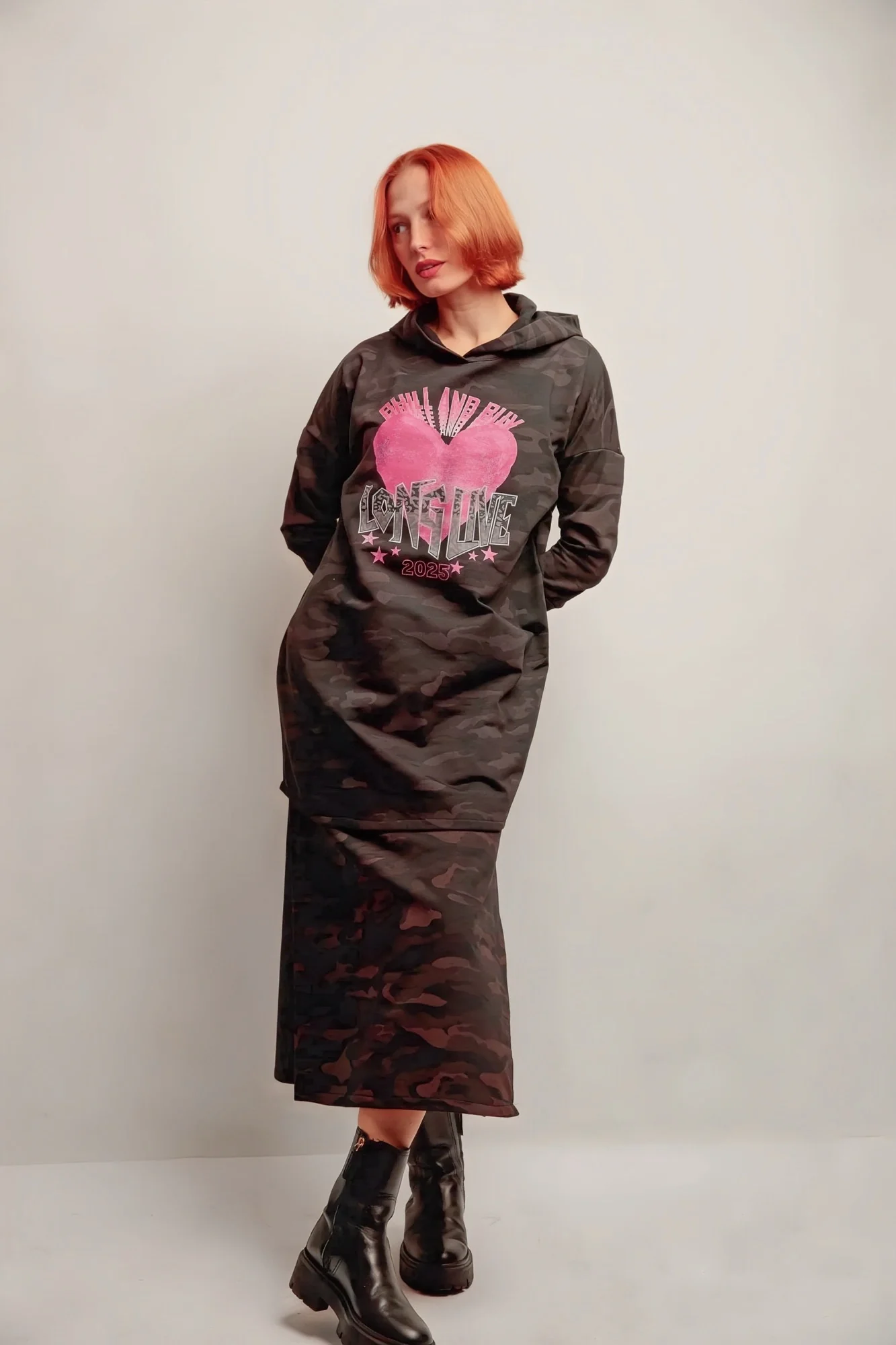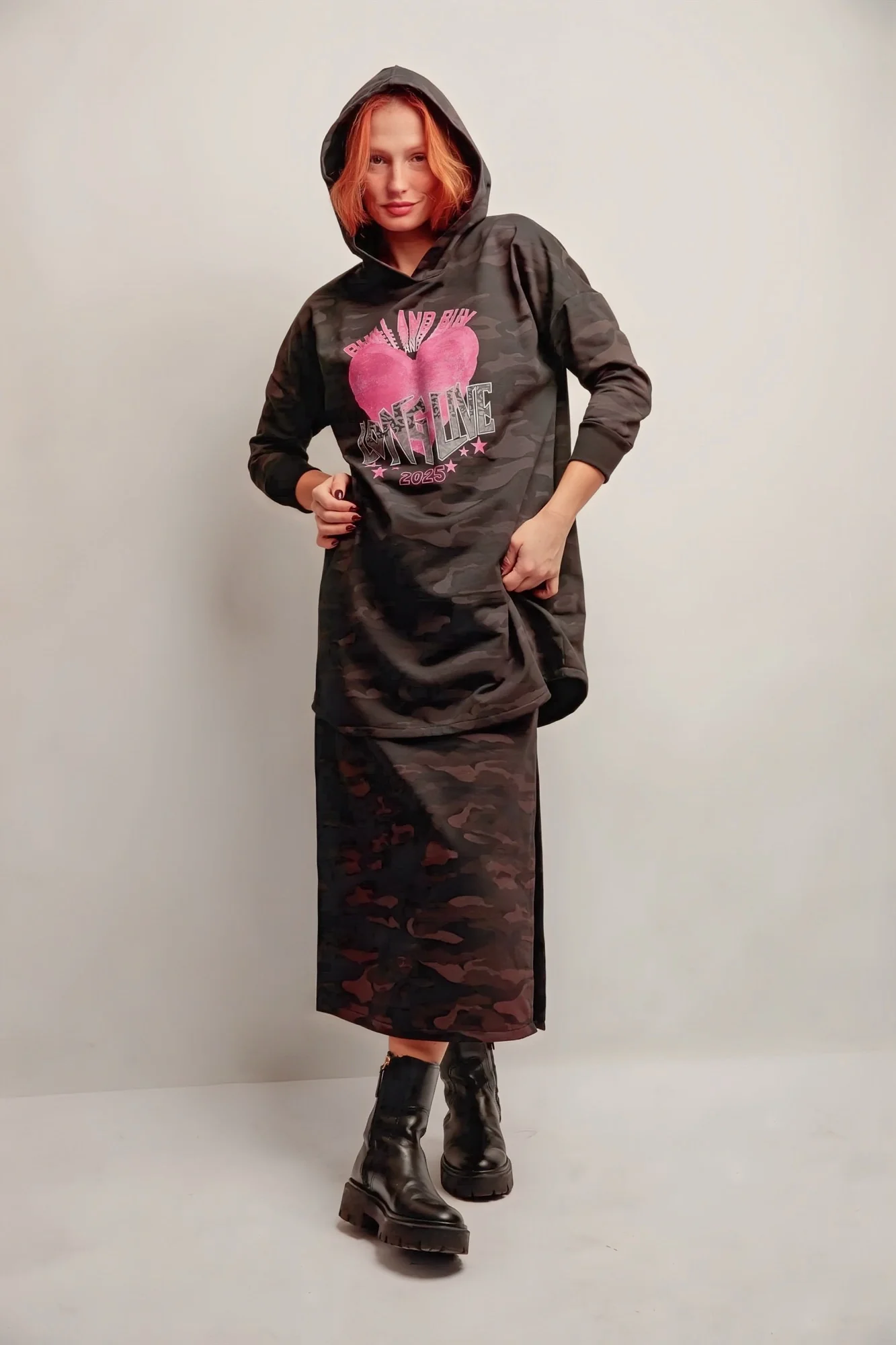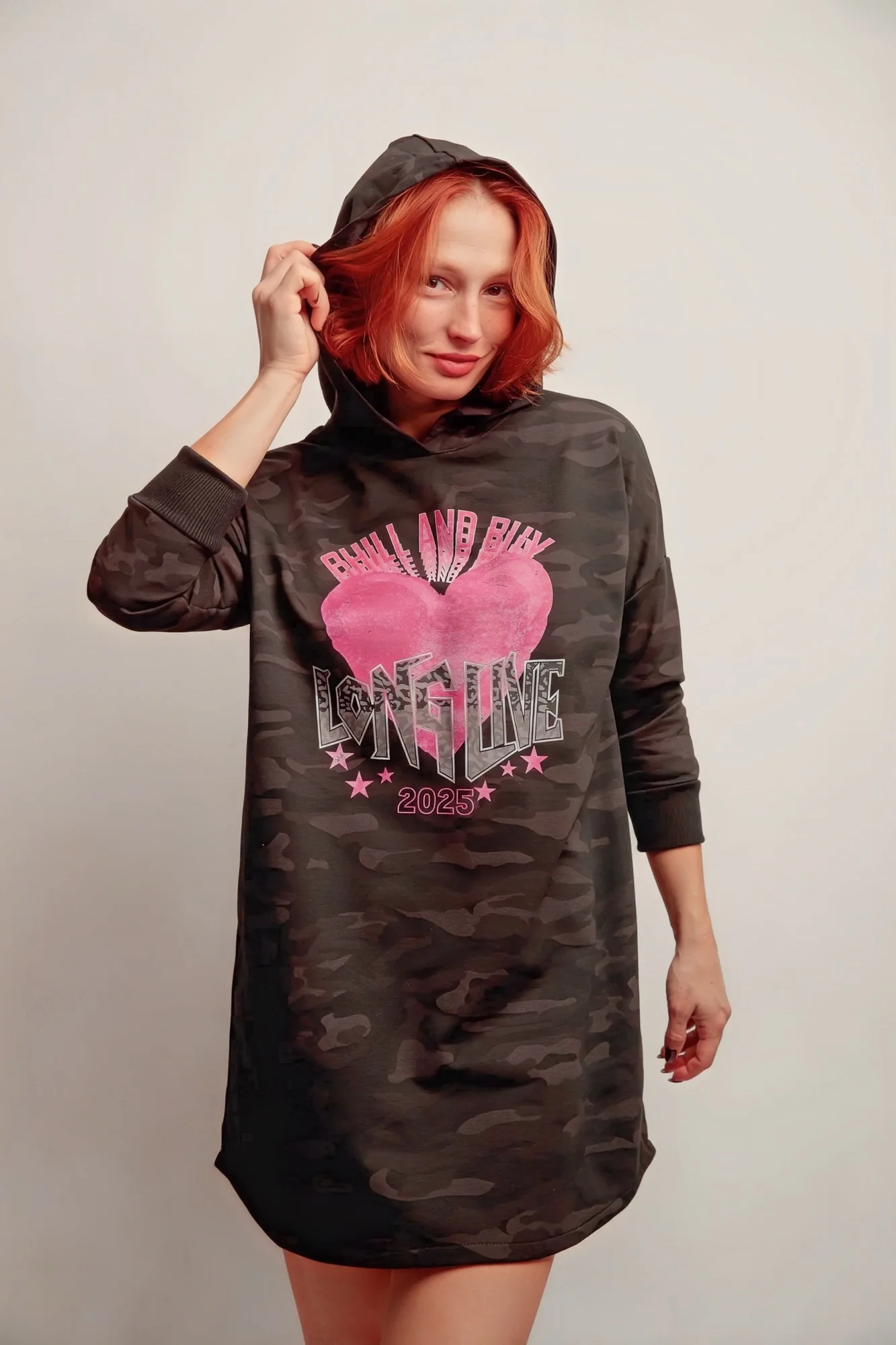 Alliez confort et style avec la Robe Capuche Cœur Live, une pièce à l’esprit urbain et féminin. Son tissu camouflage aux nuances de noir et de gris, rehaussé d’un intérieur doux en molleton, en fait la compagne idéale des journées décontractées.