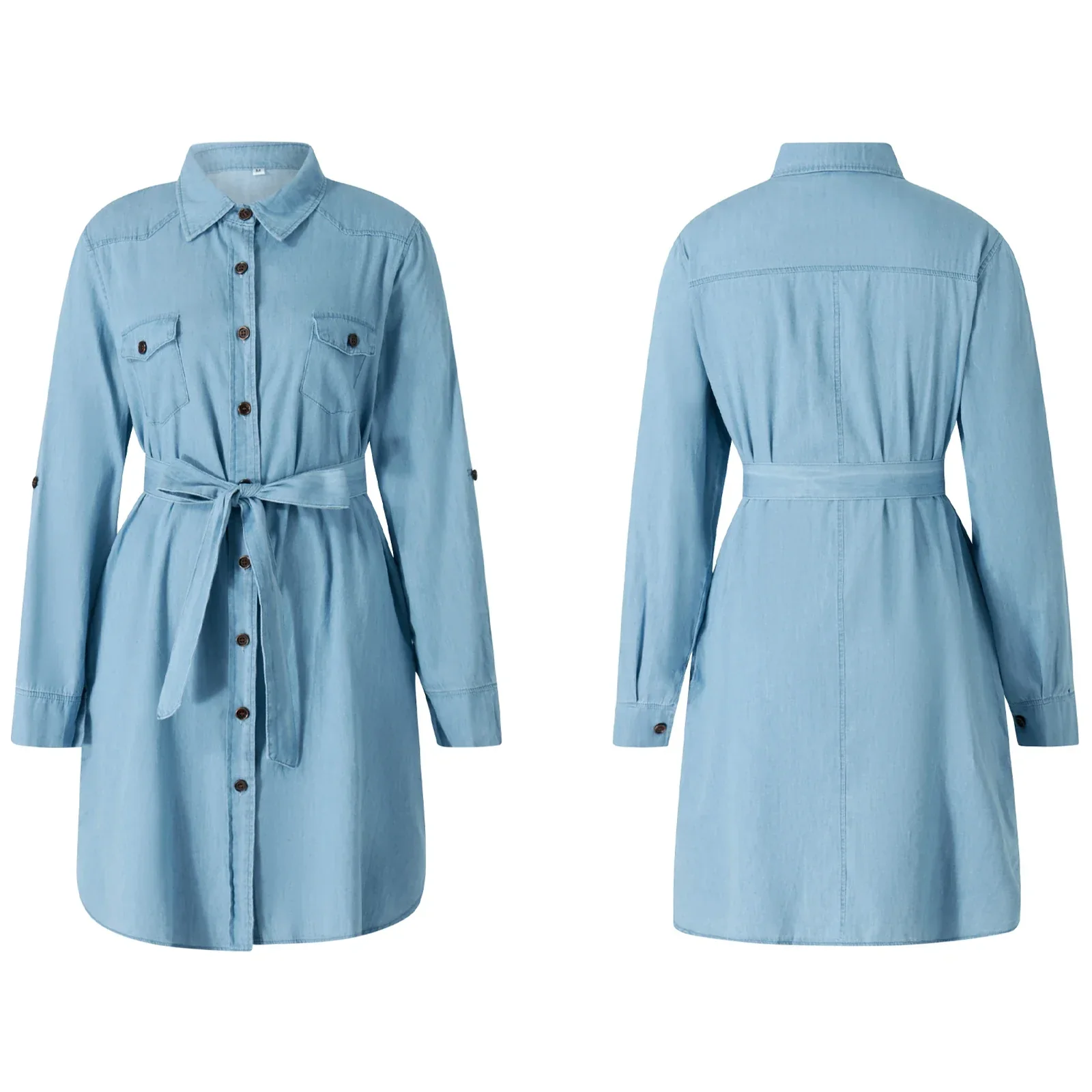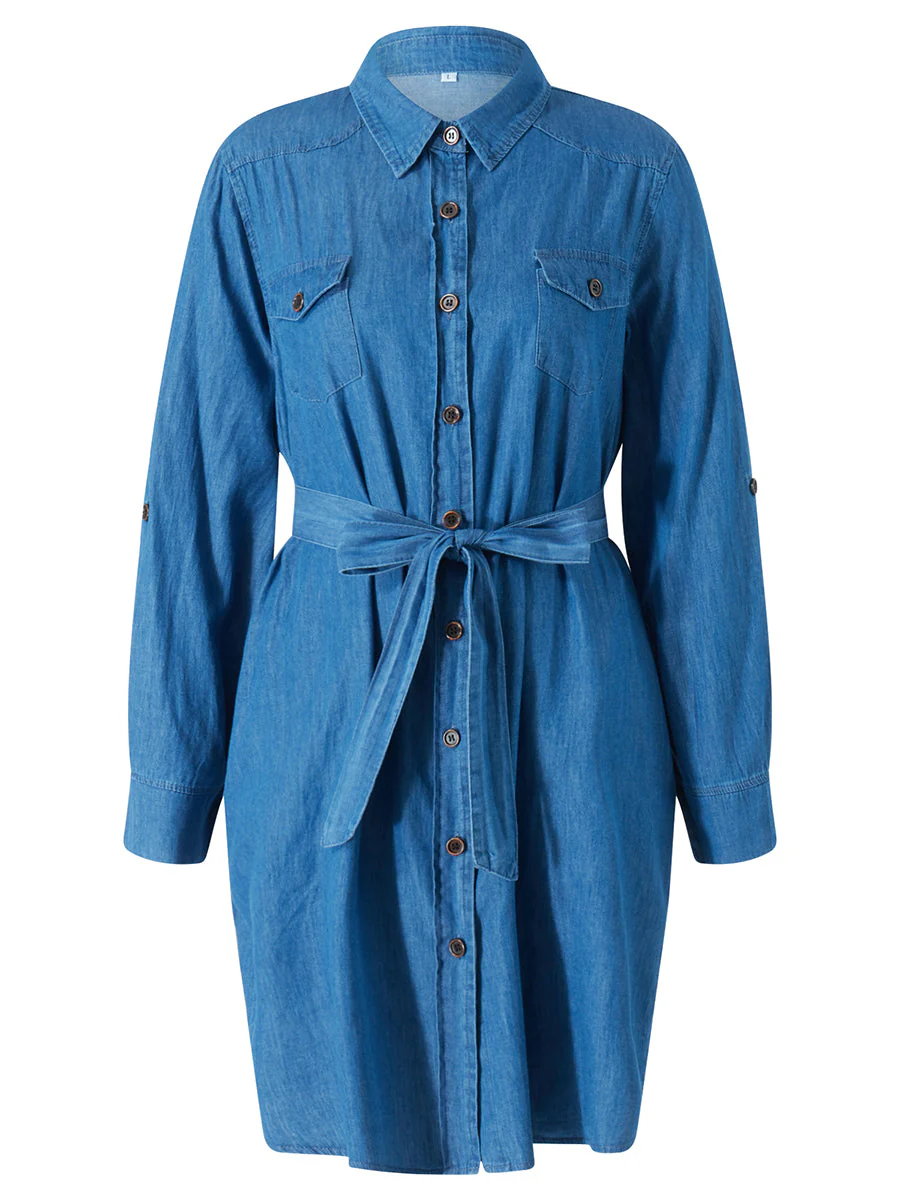 Robe Chemise Courte en Jean en bleu clair et en taille S. Matière : polyester stretch. Longueur : courte. Manches : longues. Disponible du XS au XXL.