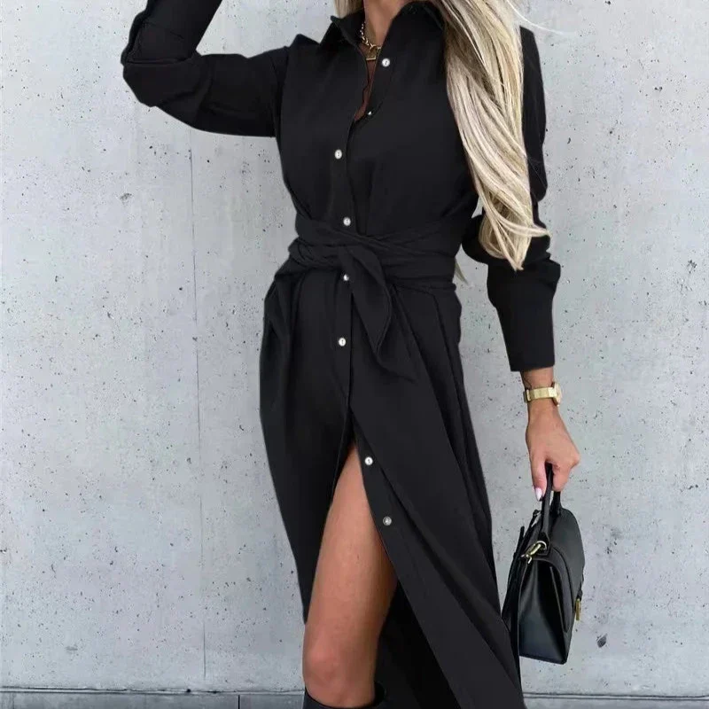 La Robe Chemise Noire est l’essence même de l’élégance intemporelle. Sa coupe droite et ses manches longues offrent une allure raffinée et structurée, parfaite pour toutes les occasions. Confectionnée en polyester de qualité, cette robe longue allie style et praticité pour un look impeccable en toute simplicité.