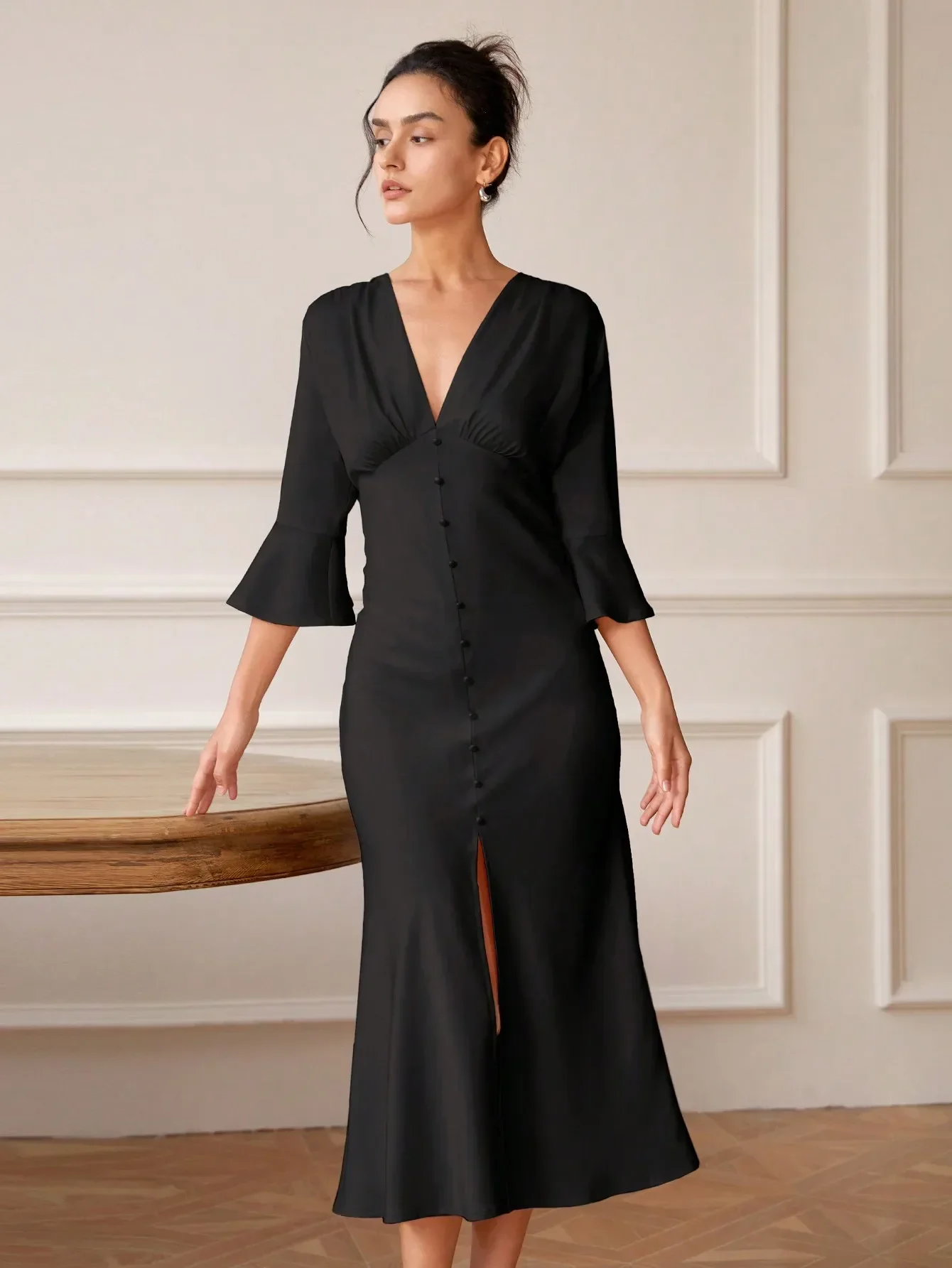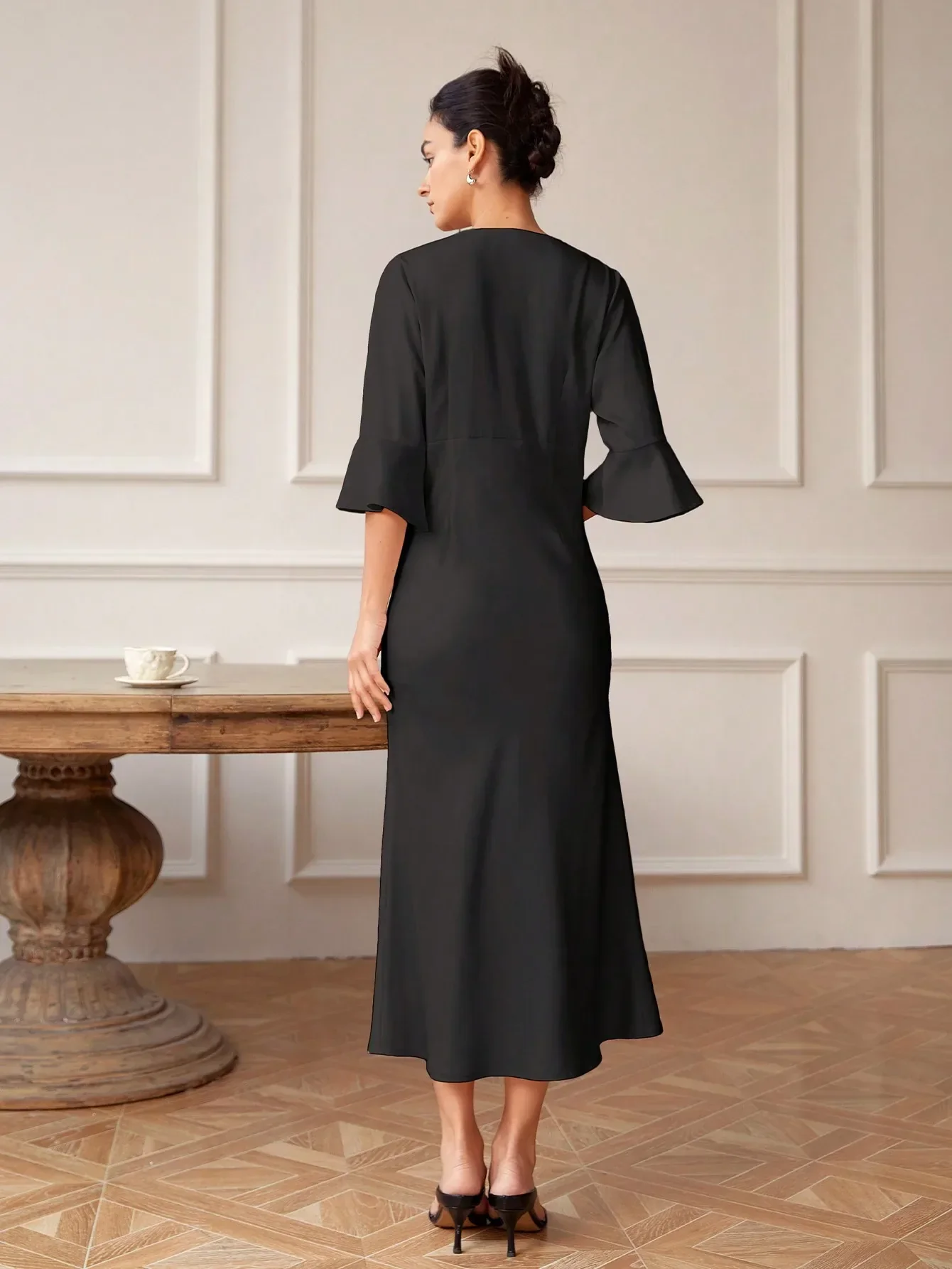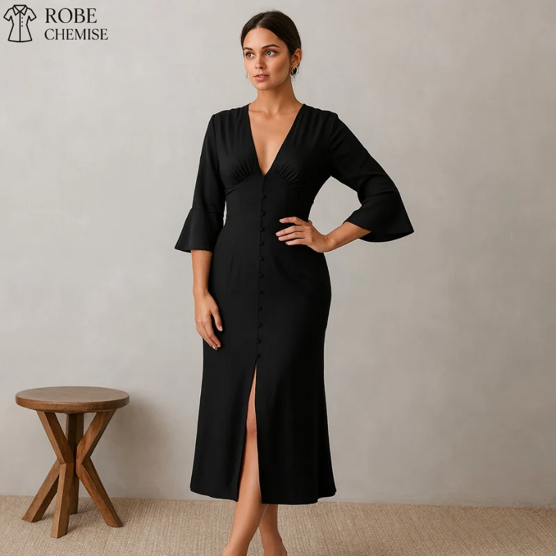 La Robe Chemise Satin Noir dans toute sa splendeur, prête à sublimer ton style et à te démarquer lors des occasions spéciales.