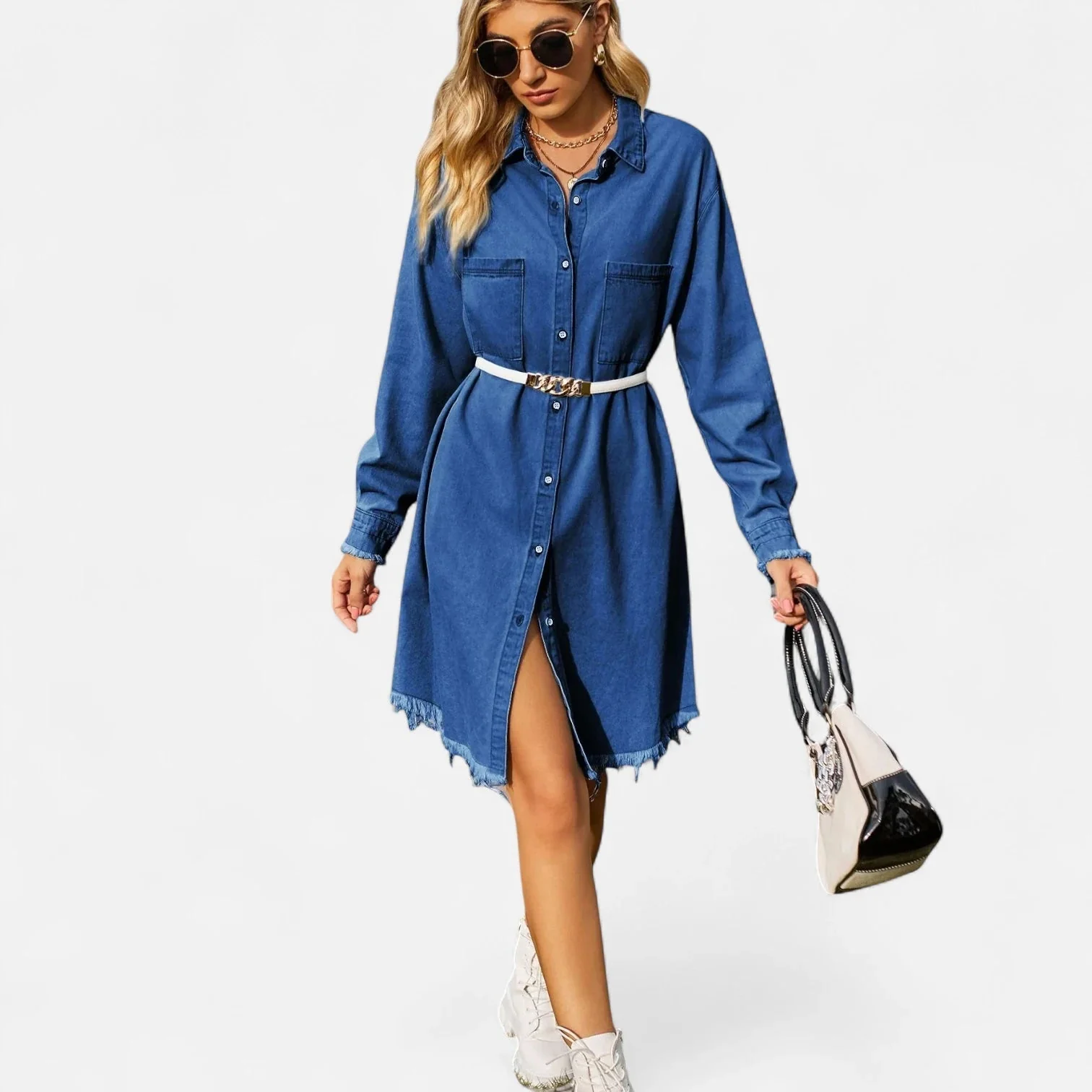Découvrez la robe chemise en jean mi longue, pensée pour allier aisance et style au quotidien.
