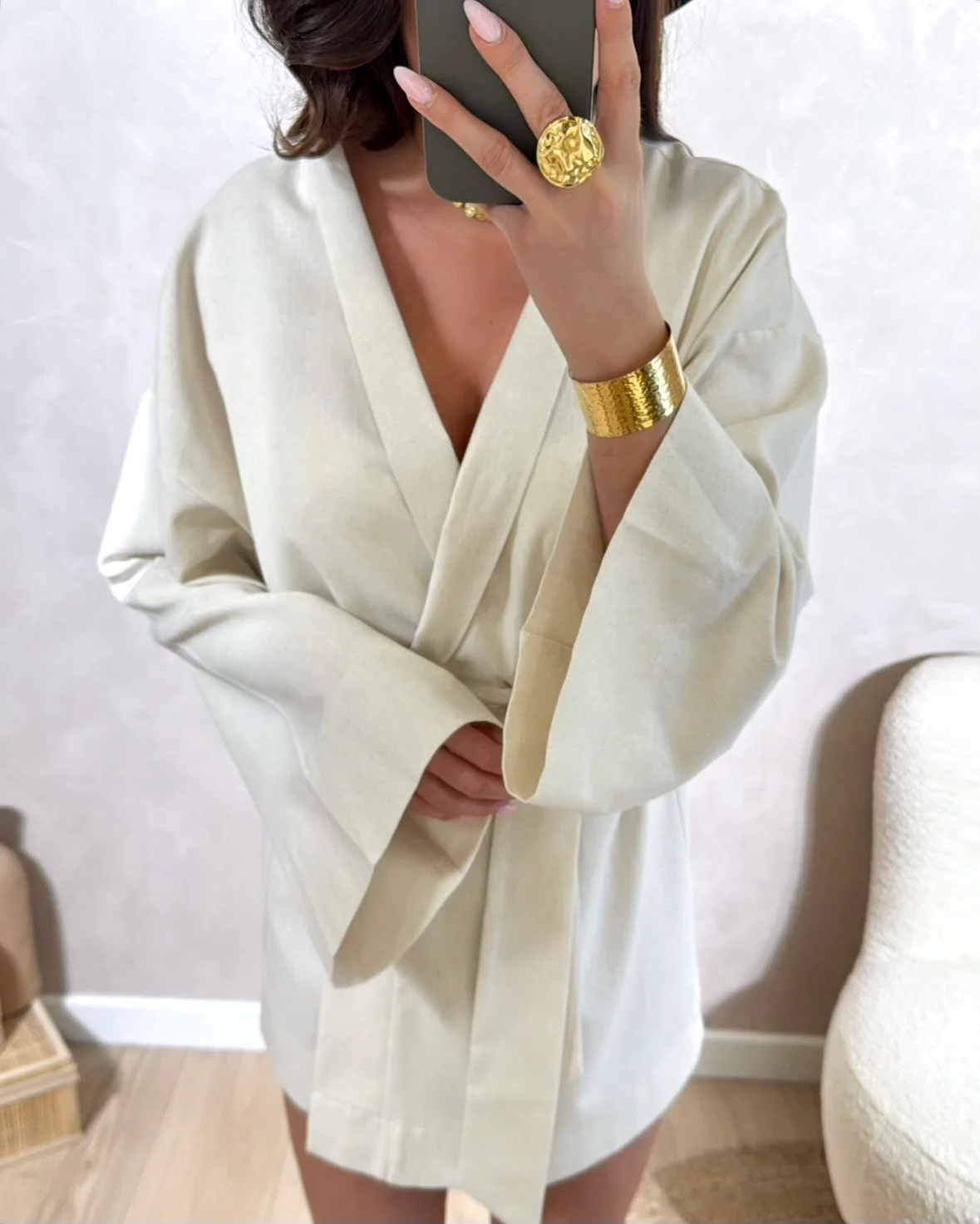 Robe Clem • Esprit kimono • Manches larges • Ceinturée à la taille • Pauline mesure 1m65 et porte une taille S • Composition : 70% Coton 30% Lin • Mode d’expédition : Colissimo avec ou sans signature. • Livraison offerte à partir de 69€ d’achat