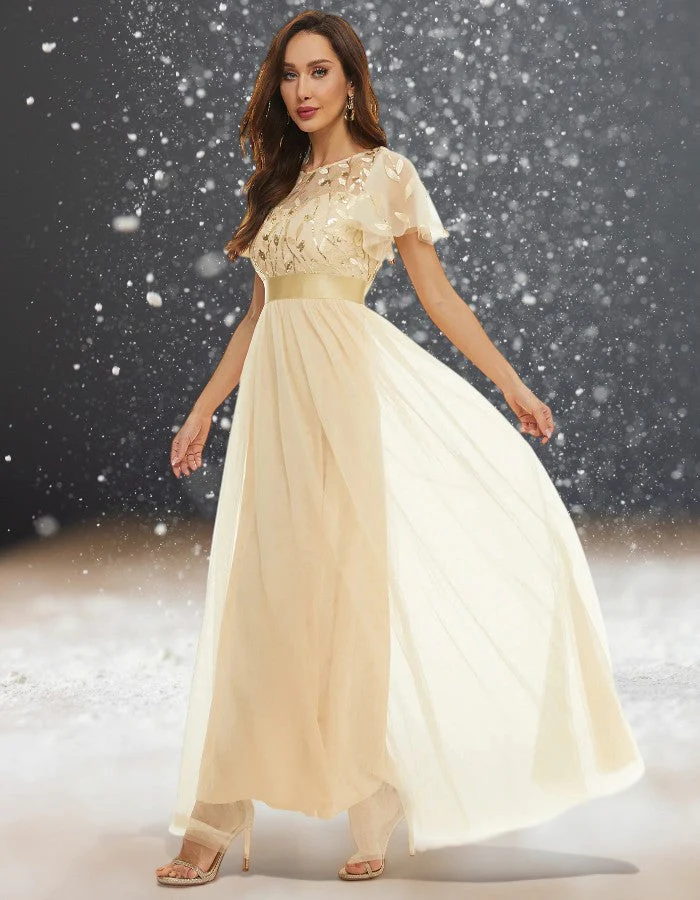 - Matière de la robe : Mousseline aérienne, polyester durable, rehaussée de paillettes scintillantes pour une allure glamour et confortable.