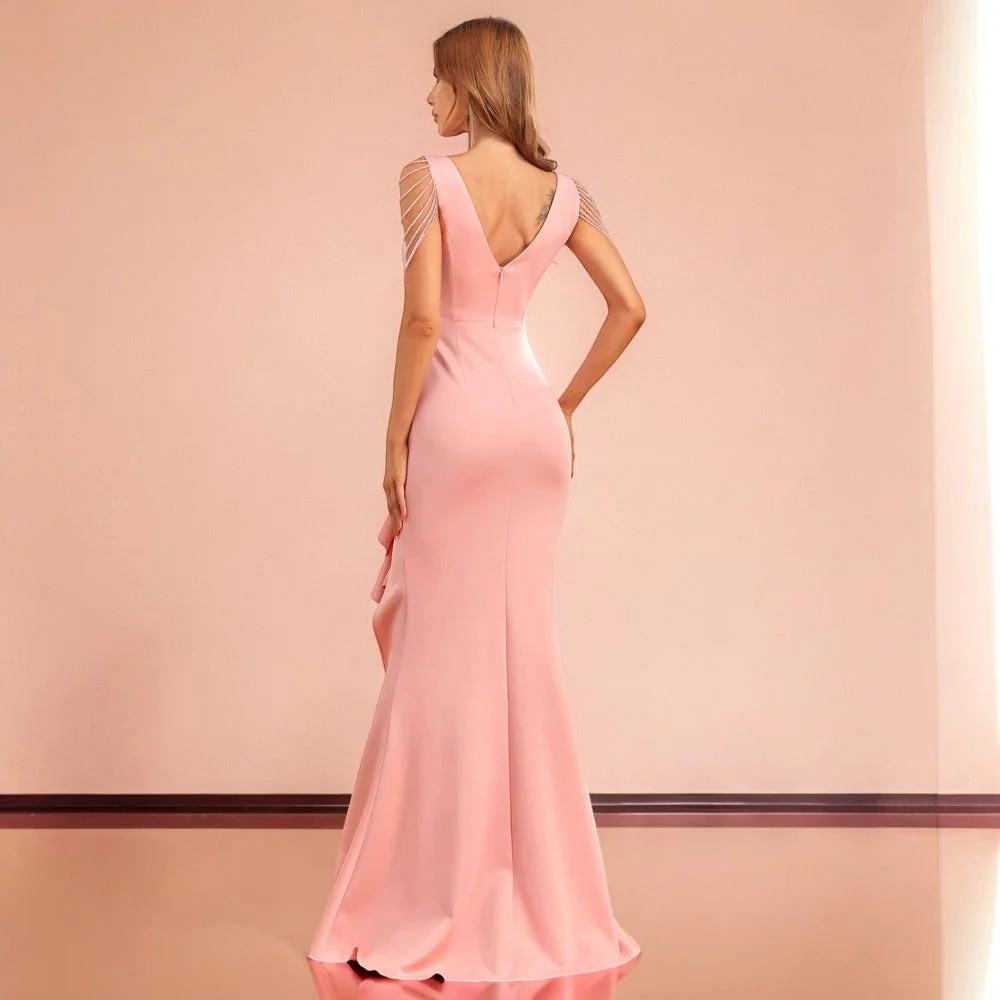 Cette robe cocktail rose poudré fait de chaque occasion un moment inoubliable. Son allure longue, ornée de volants asymétriques, est faite pour capter les regards.