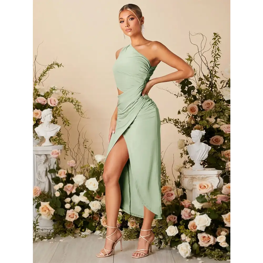 - Coupe asymétrique avec une épaule découverte et une découpe à la taille, créant une silhouette moderne et séduisante.