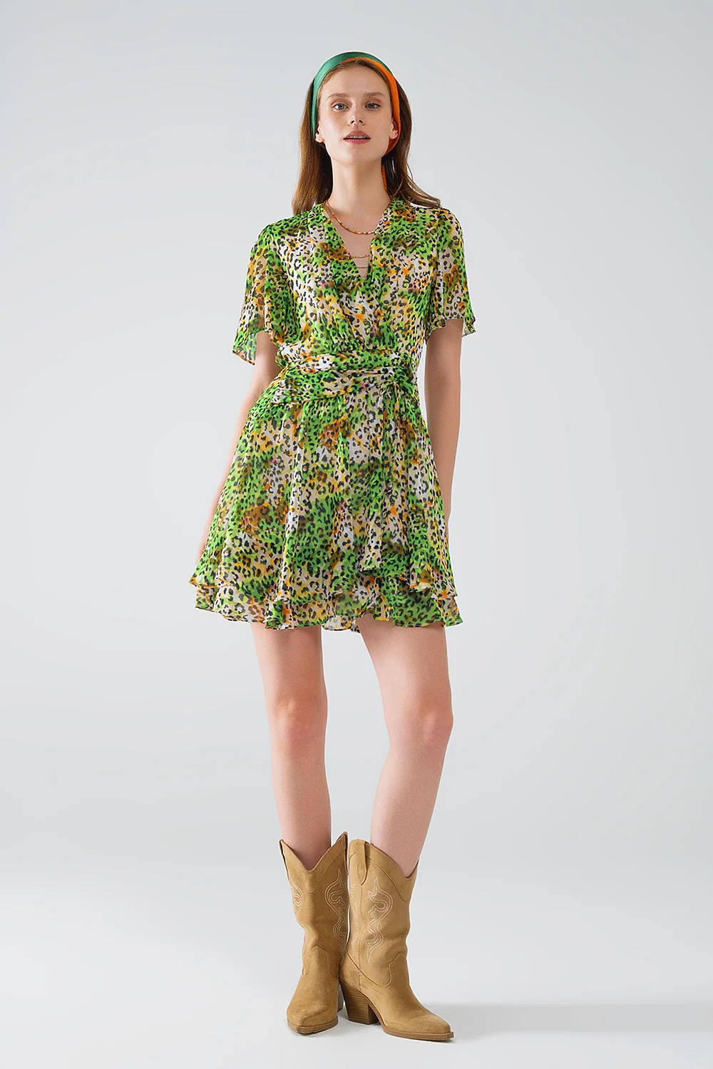 Robe Courte Femme Verte Multicolore – Top Croisé & Imprimé Animalier