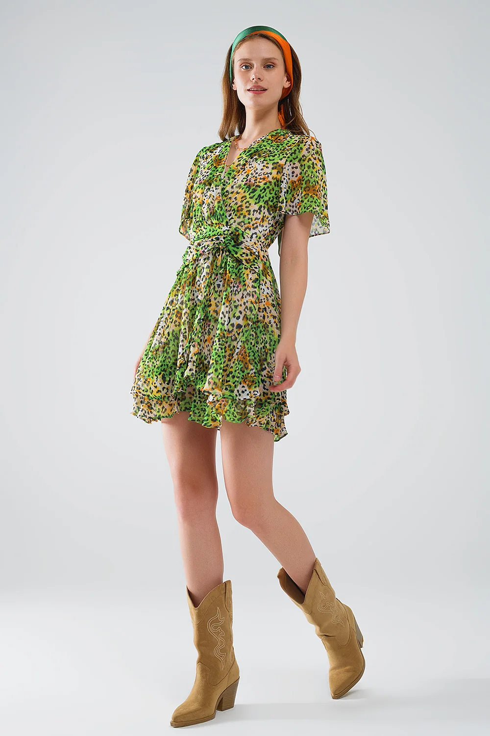 Robe courte verte multicouleure avec top croisé à imprimé animalier