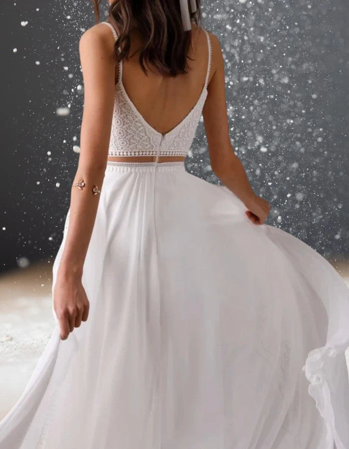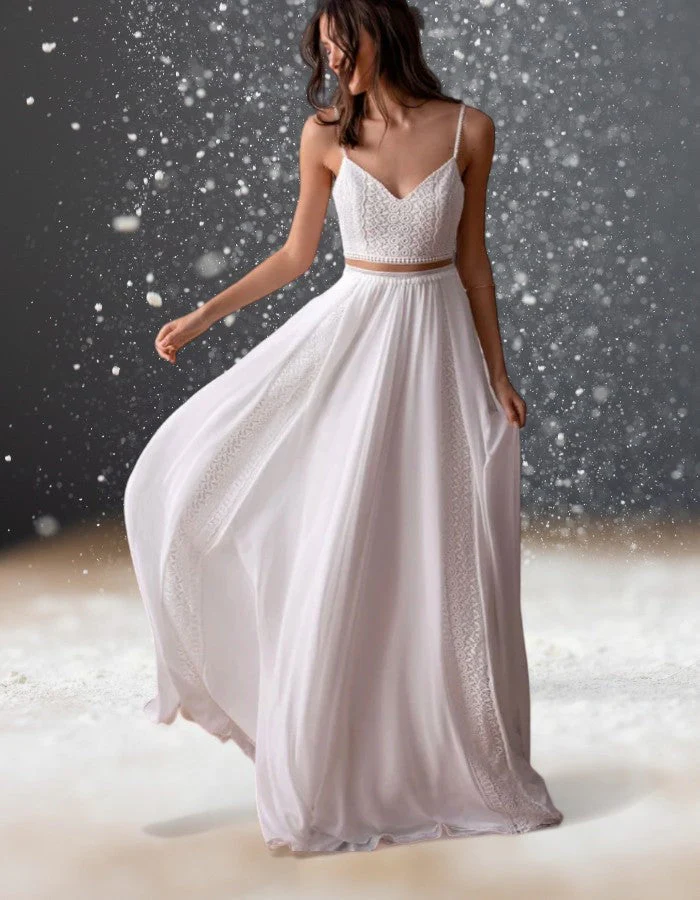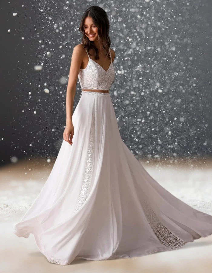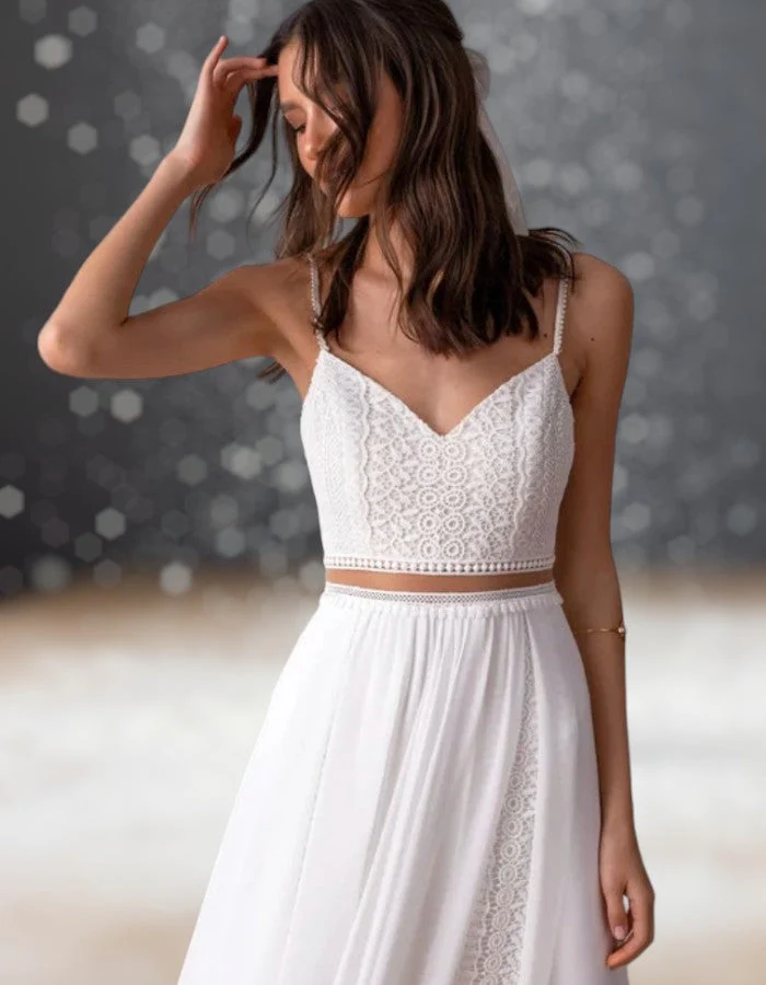 Incarnez la grâce et la liberté d’esprit avec notre robe cocktail de mariage bohème en deux parties. Cette création sublime, conçue pour capturer l’essence de l’élégance bohème, est l’incarnation parfaite de la finesse et du confort. Elle est le choix idéal pour celles qui désirent allier la simplicité décontractée à la beauté raffinée, une tenue parfaite pour célébrer votre journée spéciale dans une ambiance légère et romantique.