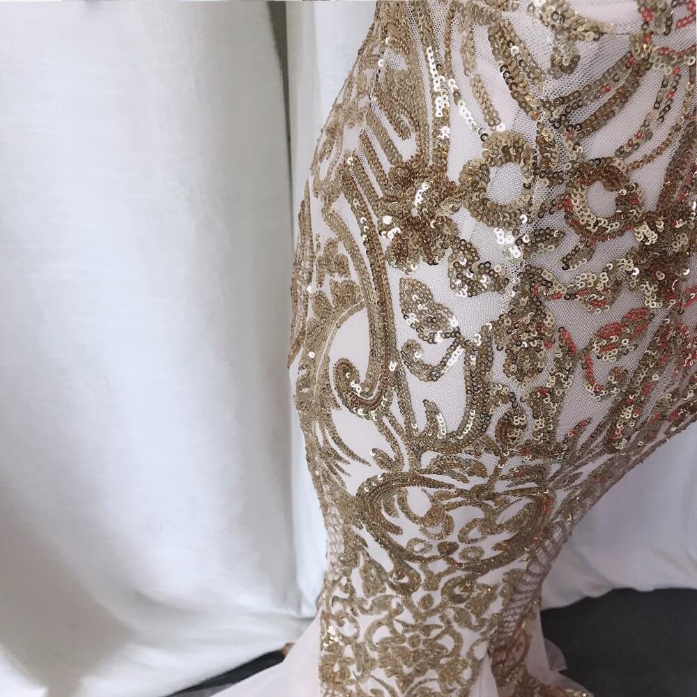 Notre ensemble de mariée princesse luxe en soie rose et aux paillettes dorées est une création qui associe la douceur de la soie rose à l’éclat envoûtant des paillettes dorées. Cette robe somptueuse vous transportera dans un univers de glamour et de raffinement lors de cette journée inoubliable.