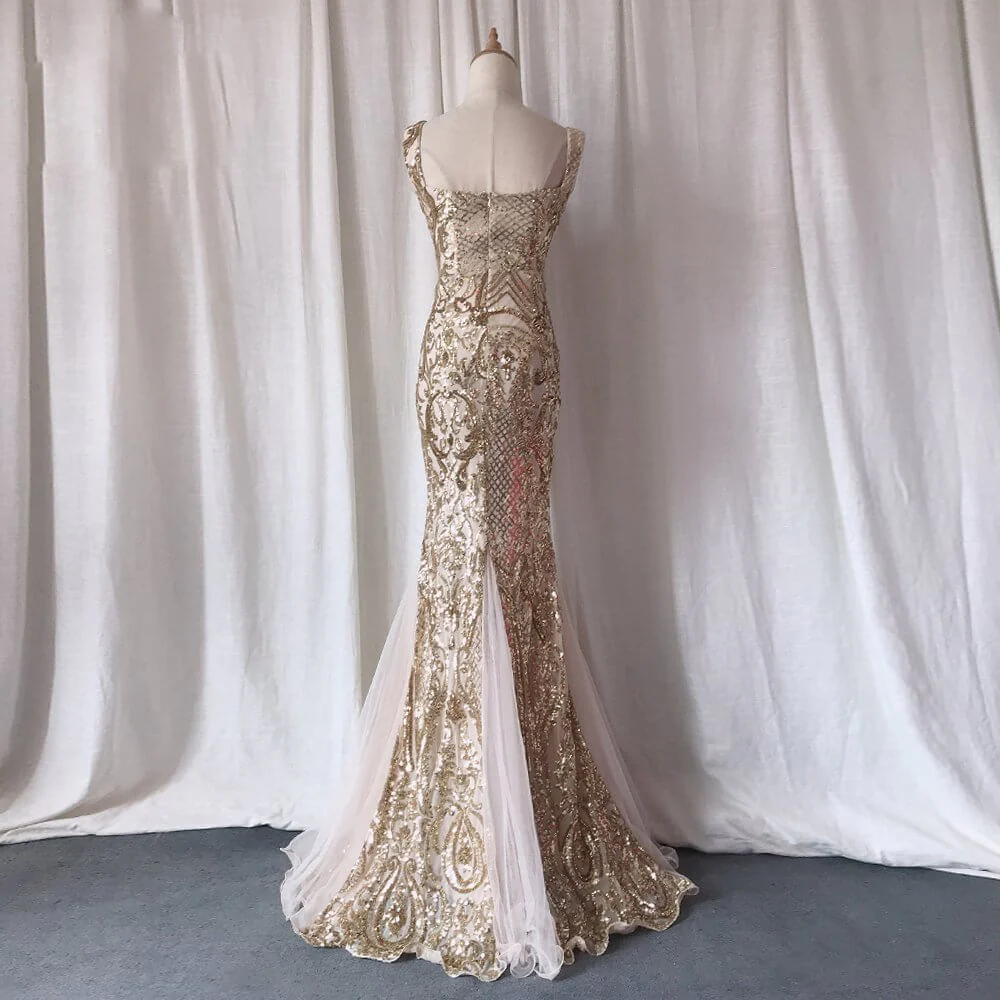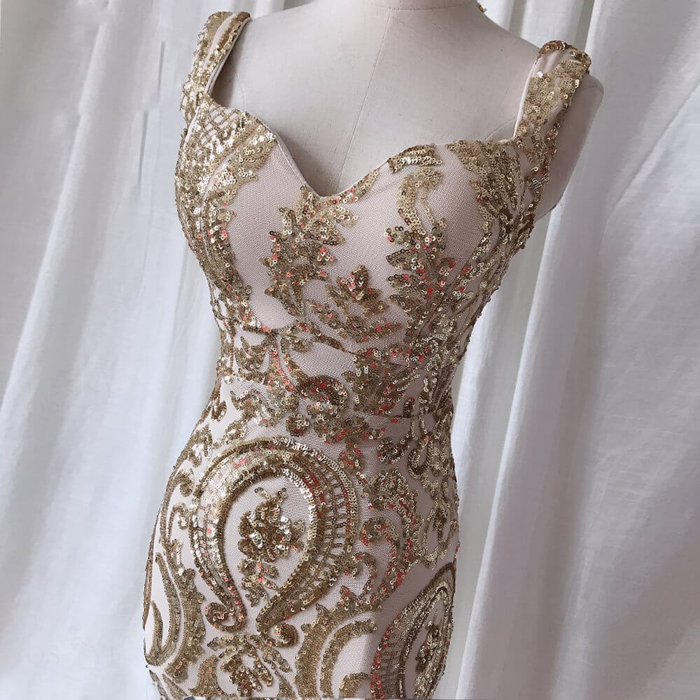 Le corsage de la tenue mariage pour mariée, rehaussé de paillettes brodées de couleur dorée, est sublimé par des bretelles délicates qui ajoutent un brin de charme à l’ensemble. Le décolleté sans manches révèle subtilement vos épaules, créant une silhouette élégante et moderne.