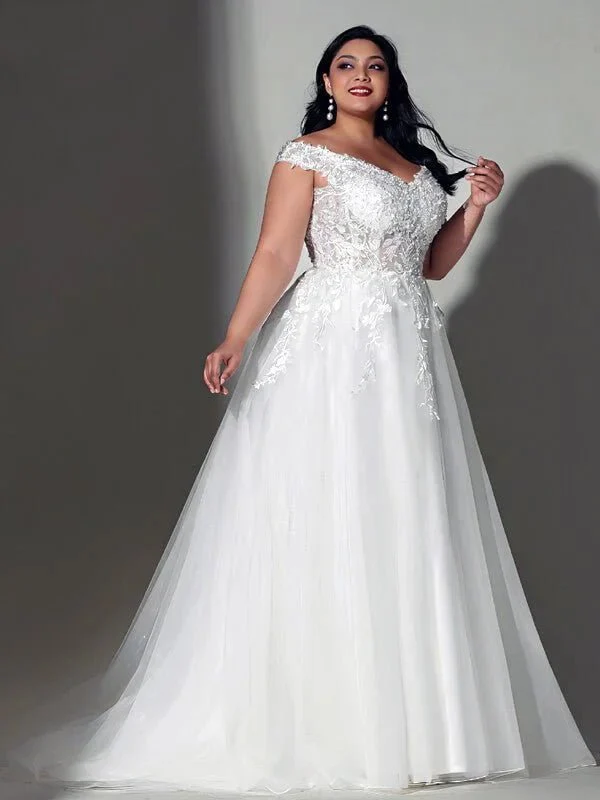 L’art délicat des motifs appliqués de dentelle sur le tulle évoque des jardins secrets et des rêves en dentelle, ajoutant une touche romantique et bohème qui ne peut qu’enchanter. Vos épaules dénudées et vos mancherons apportent une touche de glamour tout en soulignant la beauté de votre féminité.