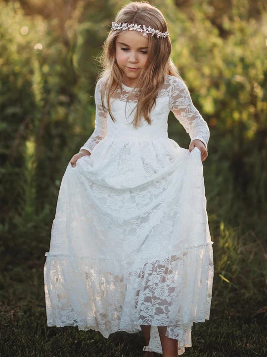 Élégante et féerique, cette robe de princesse en dentelle blanche est parfaite pour une occasion spéciale. Son design raffiné avec des manches longues en dentelle transparente apporte une touche de romantisme et de douceur. La jupe fluide et légèrement évasée assure un tombé gracieux et élégant. Idéale pour un mariage, un baptême ou une séance photo !